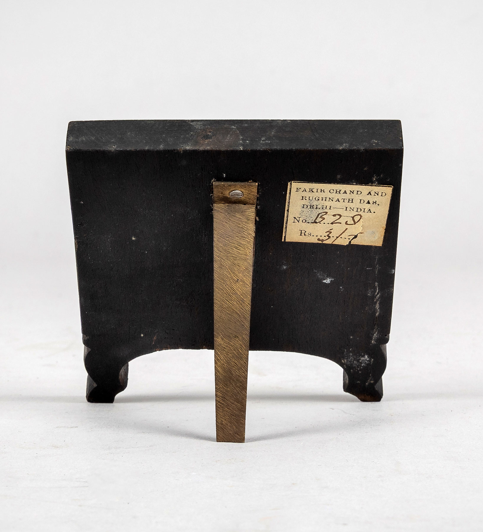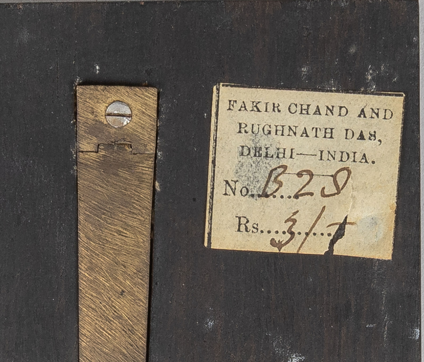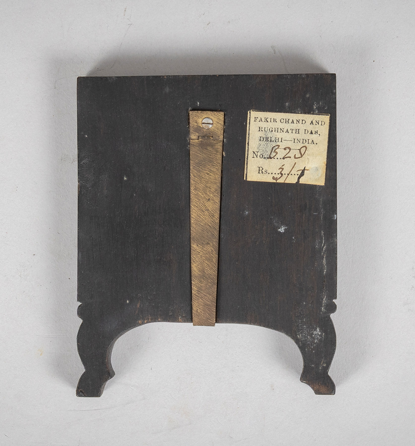 19th Century Grand Tour finely detailed miniature of The Taj Mahal hand-painted gouache on an ivory oval plaque depicting the white marble domed building, its minarets, gardens and reflecting pool, set in the original ebony frame carved with scrolling floral motifs, with a brass recessed back stand. The affixed label on the back reads: “Fakir Chand and Rughnath Das, Delhi -India”