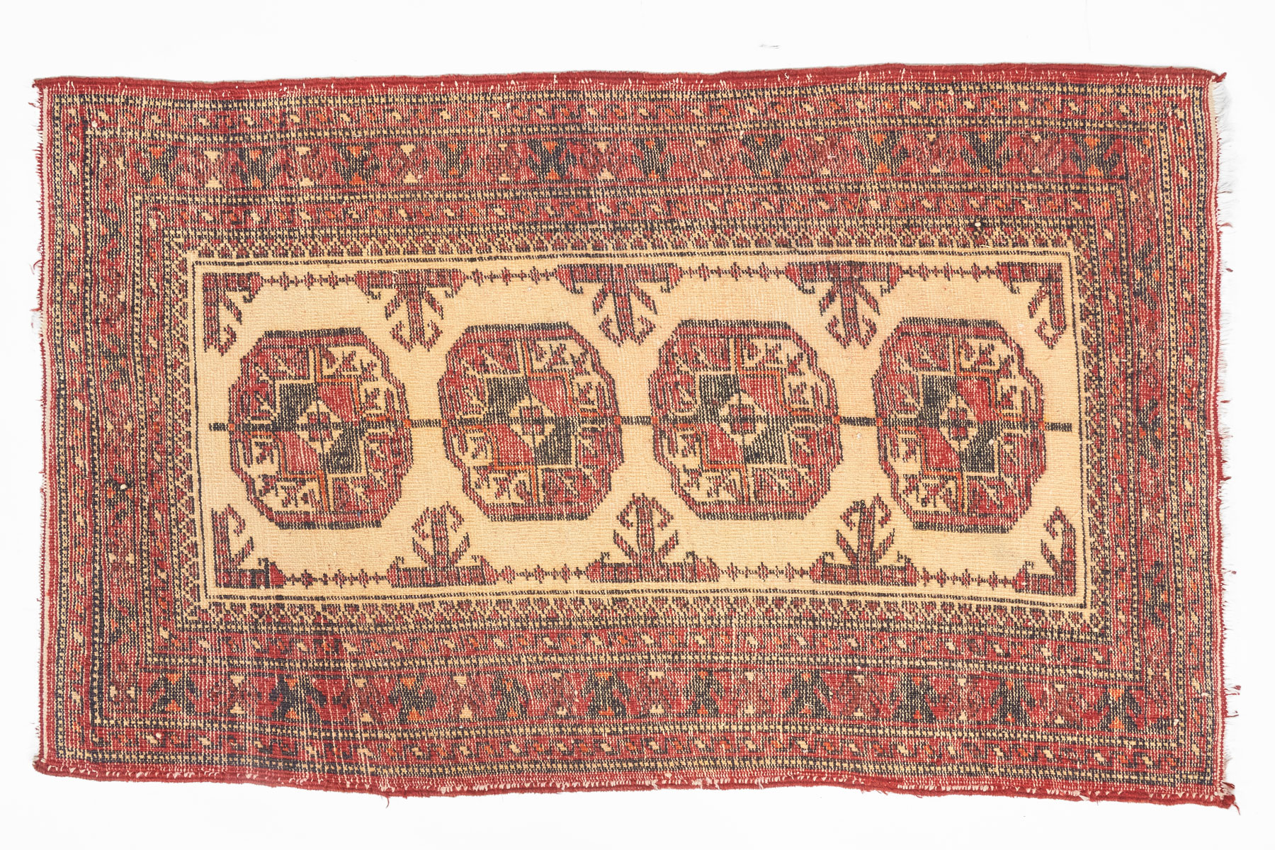 A small Bokhara hand-knotted wool rug or mat decorated with four central octagonal medallions or “guls” on an ivory background with deep red and black multiple geometric borders. This red ground is one of the defining hallmarks of Bokhara rugs. The design is precise, geometric and very symmetrical. Bokhara rugs were generally woven by Turkmen tribes in Turkmenistan and Afghanistan and across Central Asia.