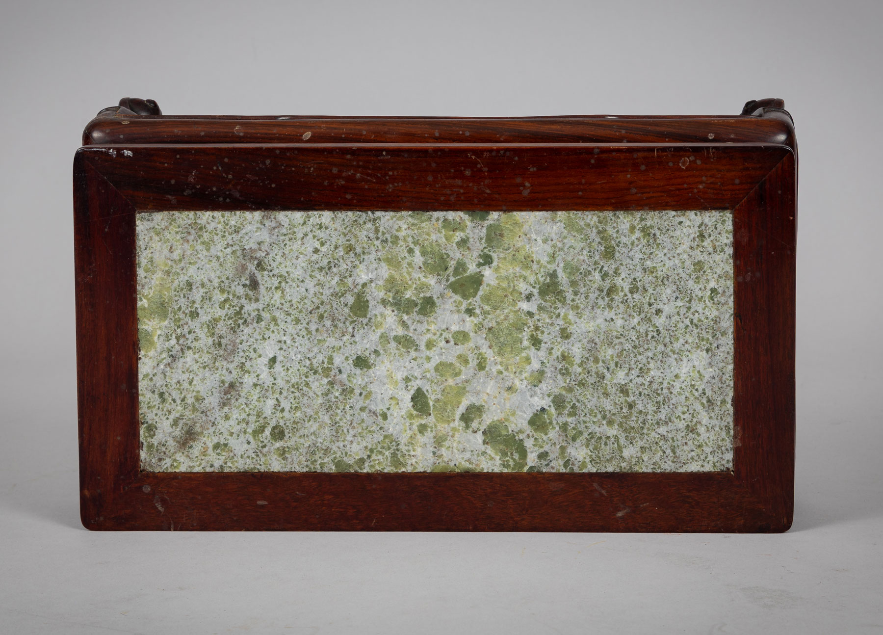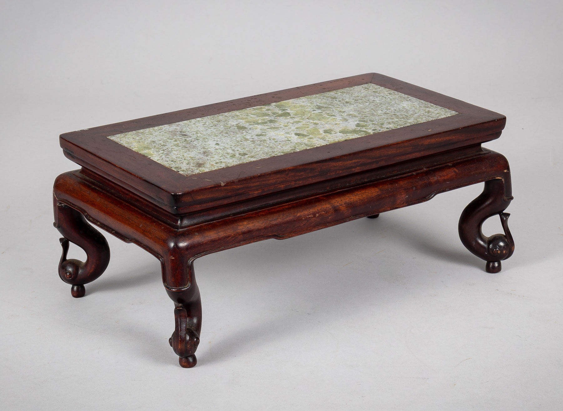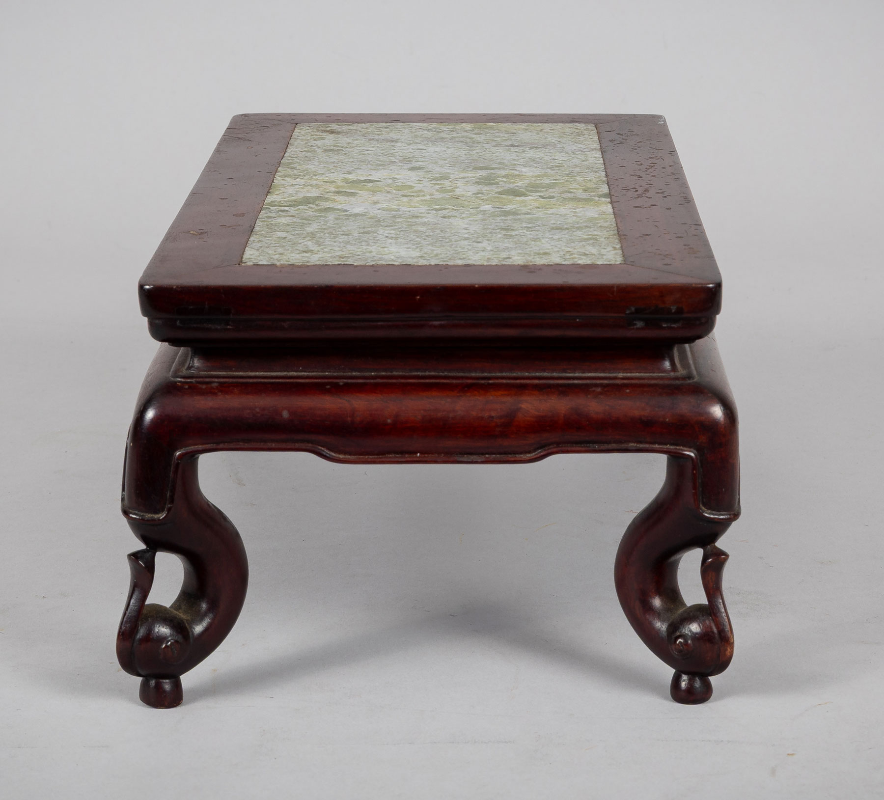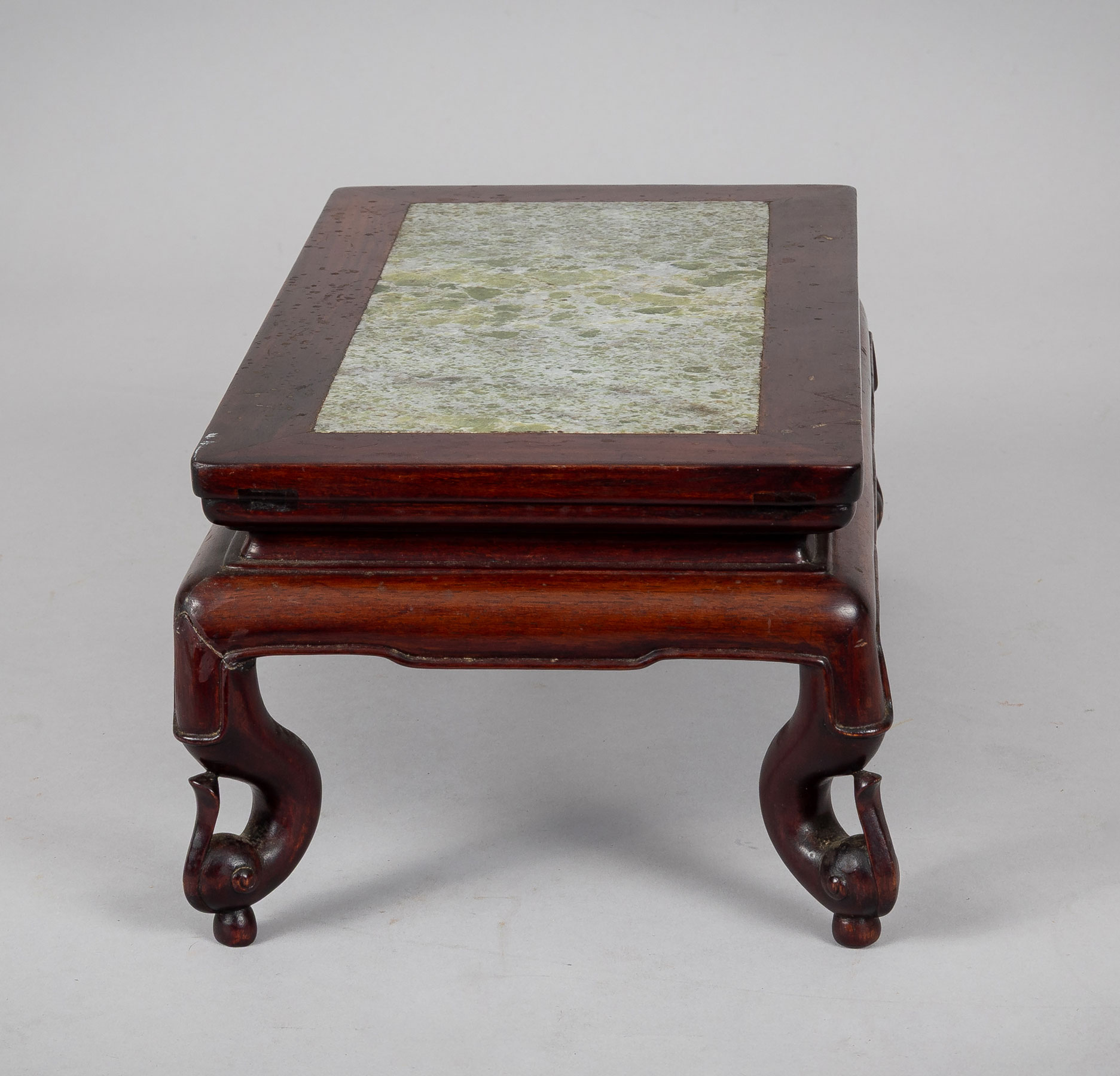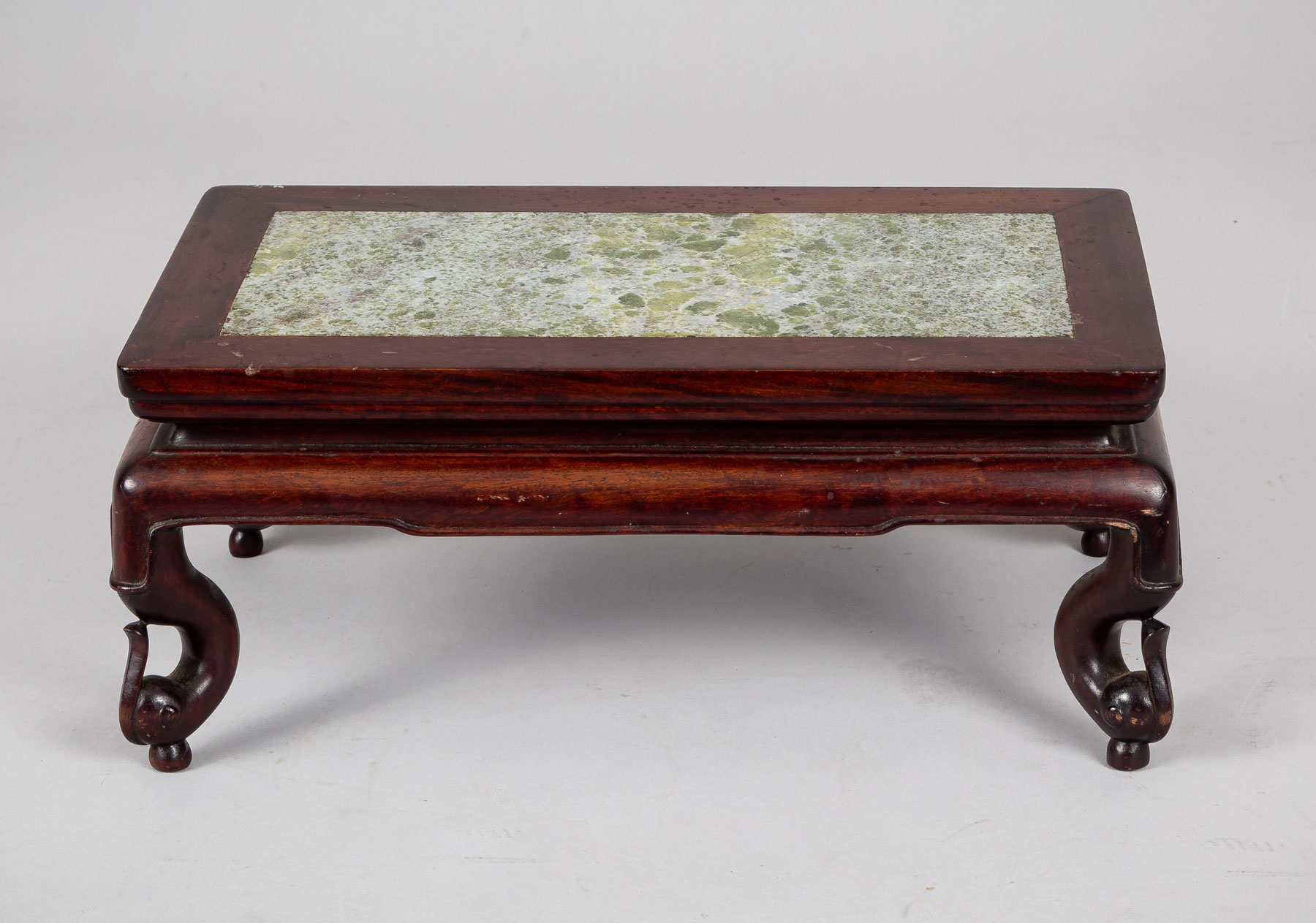 Chinese rectangular low stand, finely crafted with elegant proportions, featuring an unusual green and white marble inset top framed by rich rosewood. The carved and molded frame is raised on sculptural legs ending in snail-form feet which is an unusual decorative flourish. It is a striking piece.