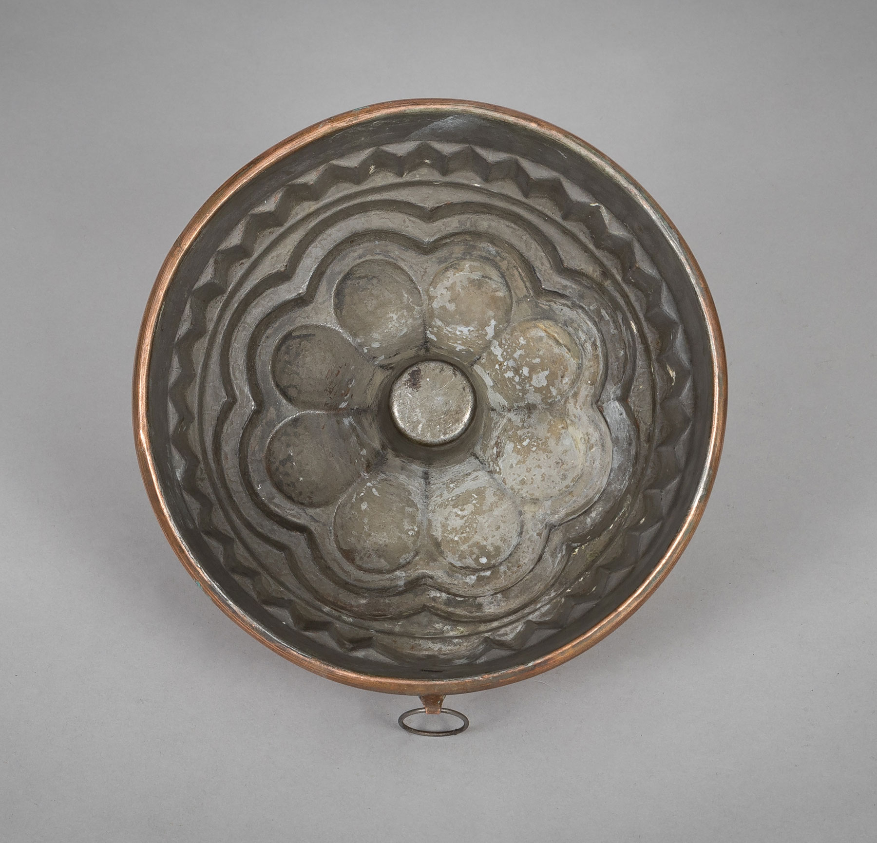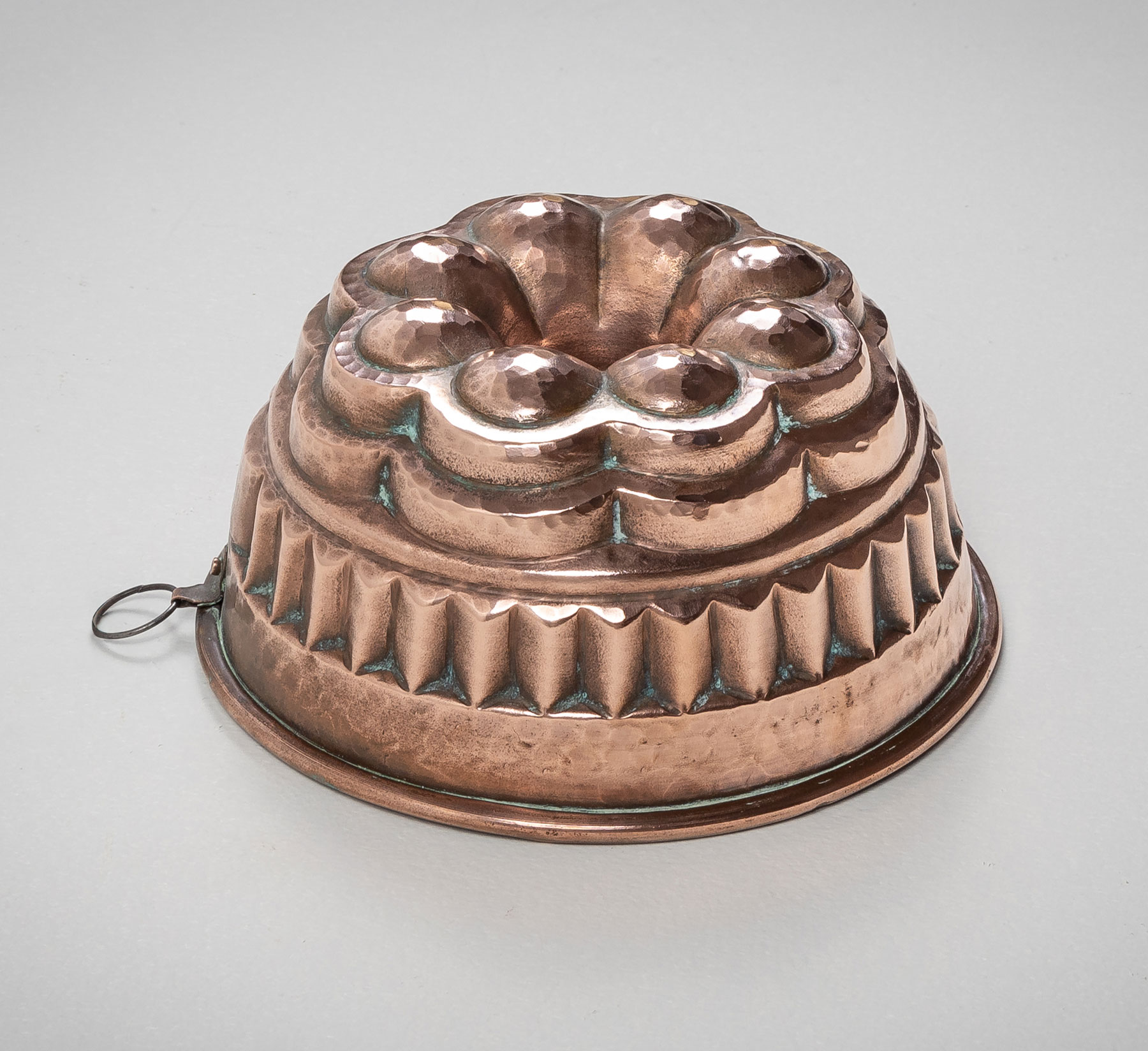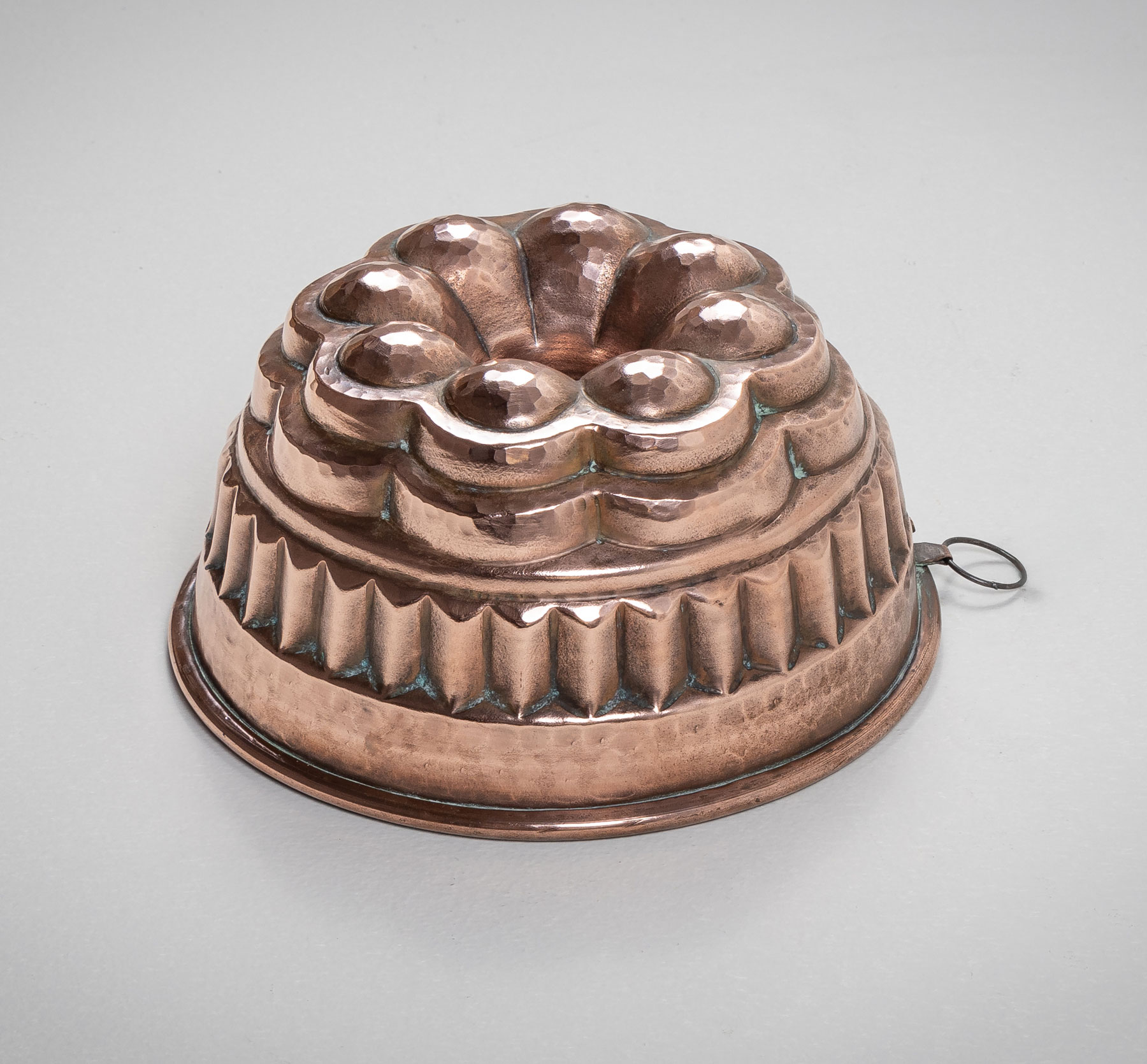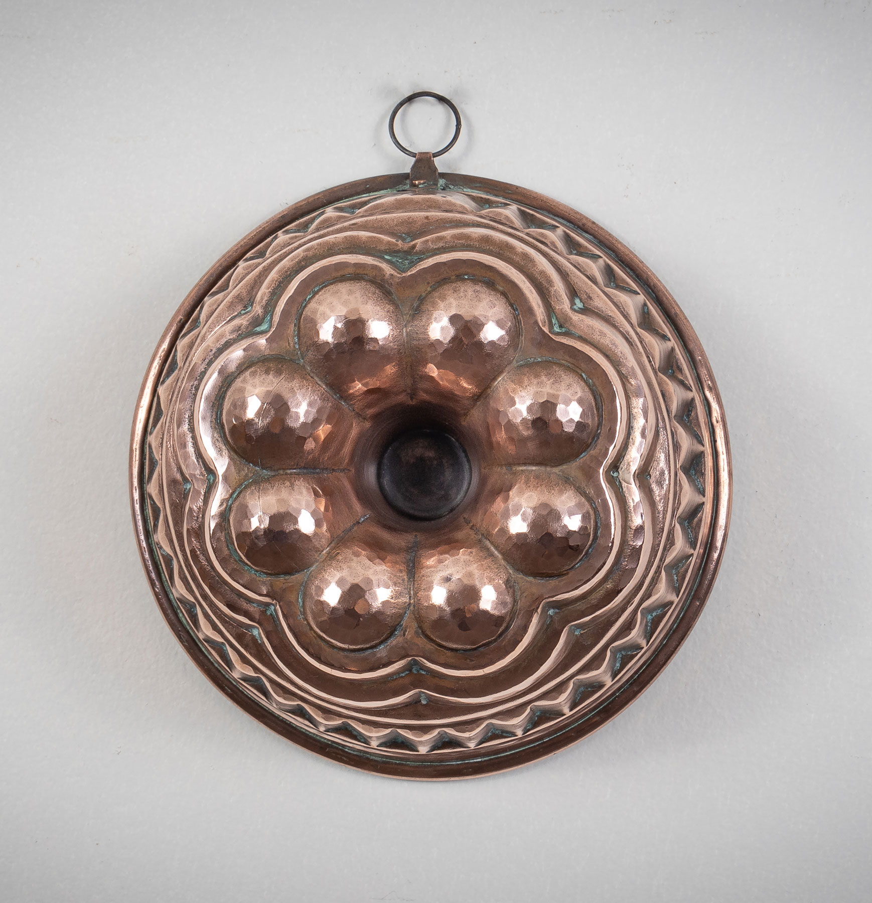Antique English copper bundt cake mold with four tiers of design with tinned lining and metal ring for hanging.