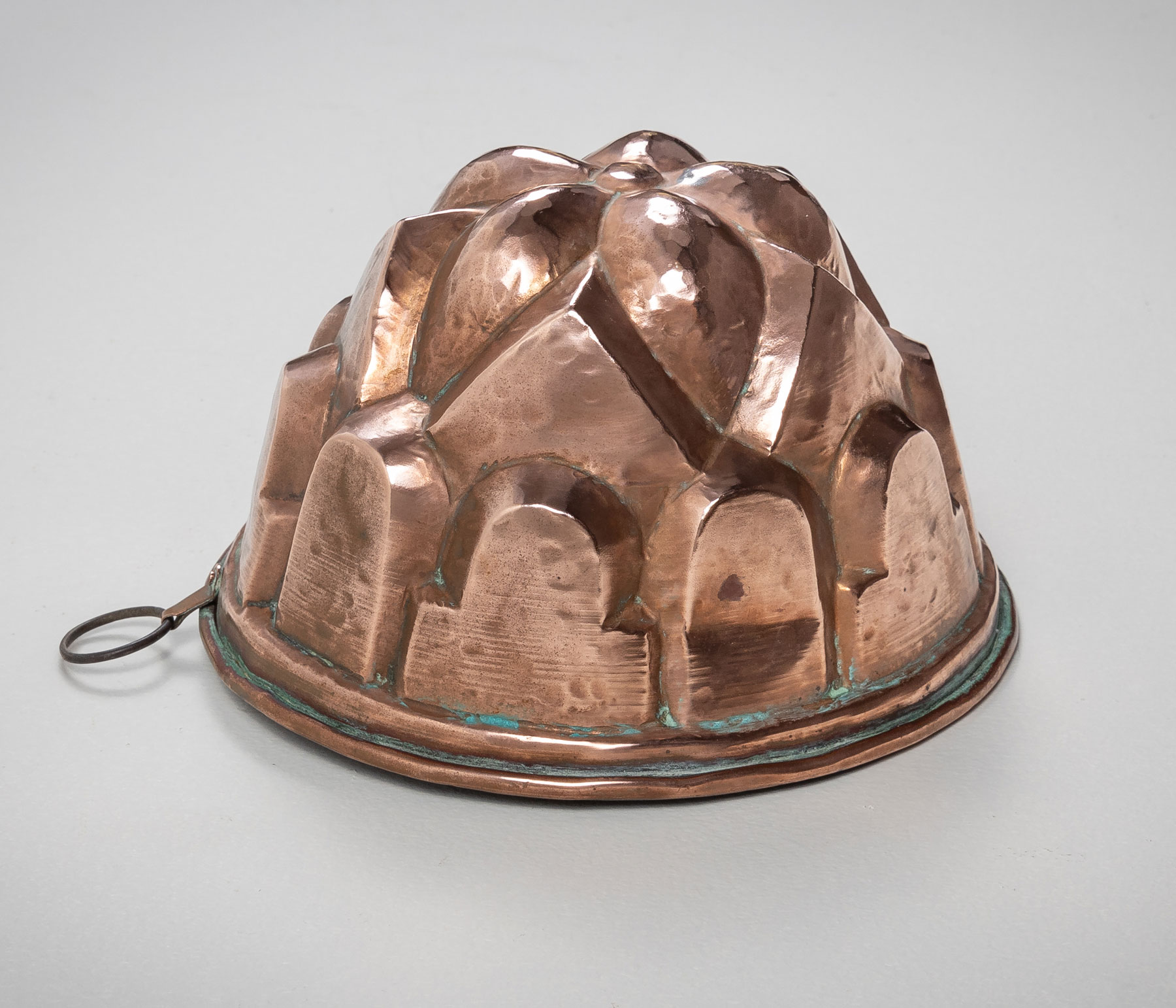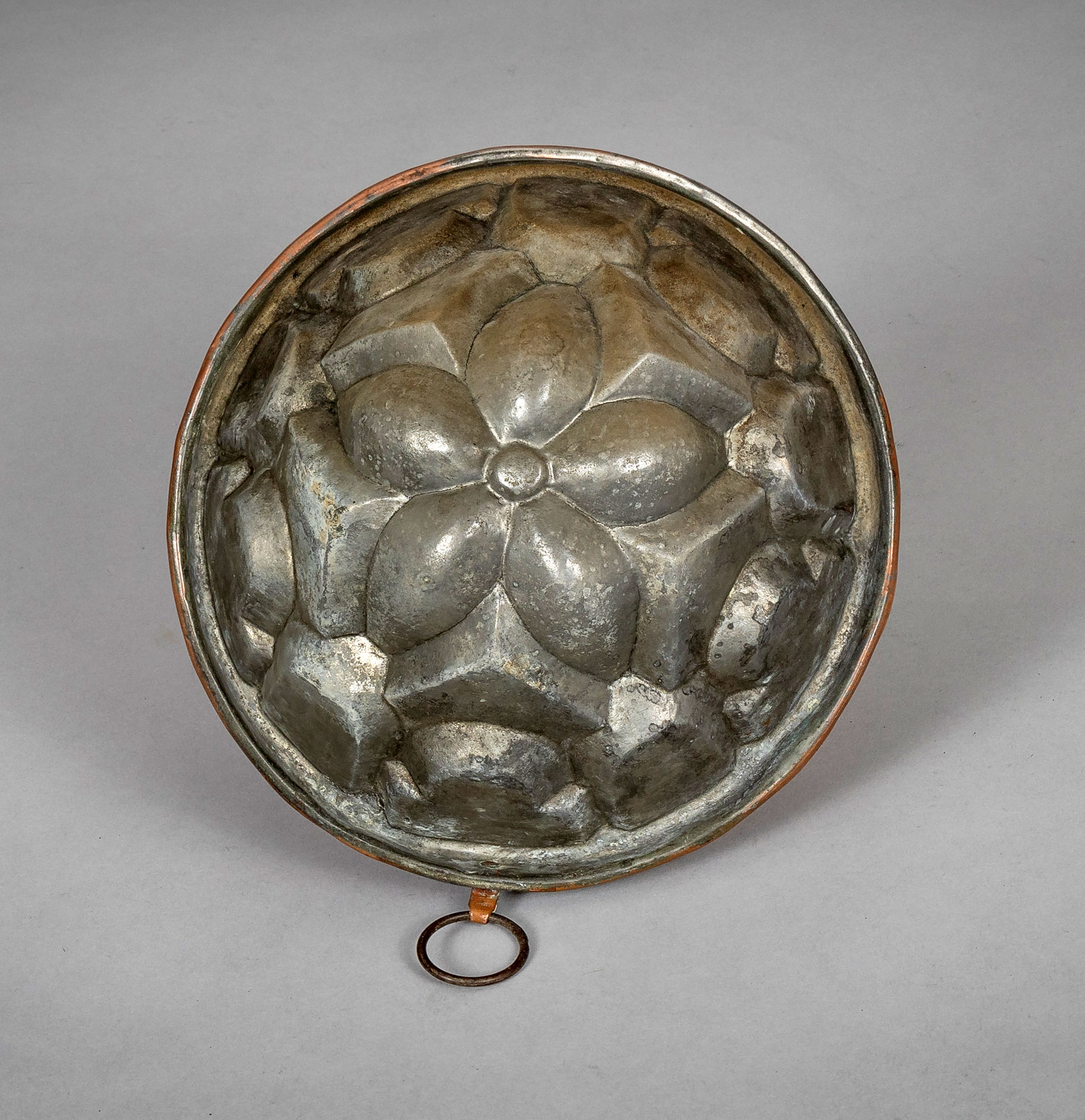 English Victorian antique large copper mold with a flower pattern at the top and Gothic designs at the bottom, a tinned lining and metal ring for hanging.