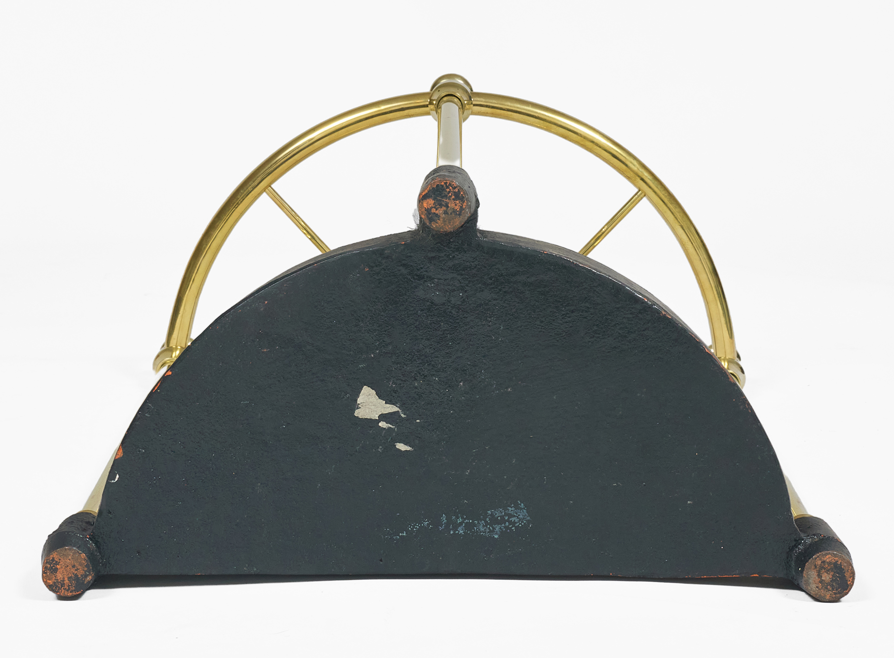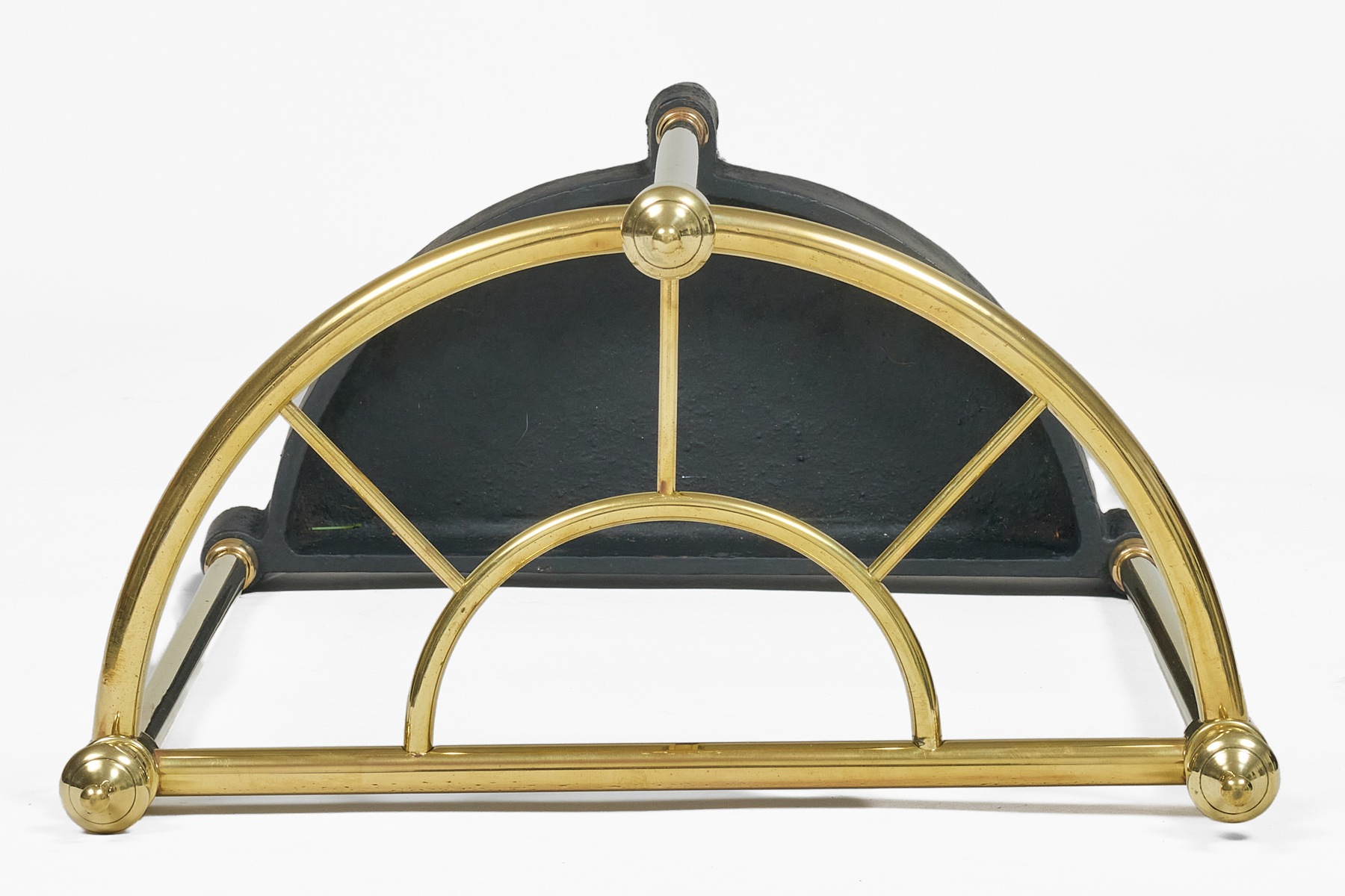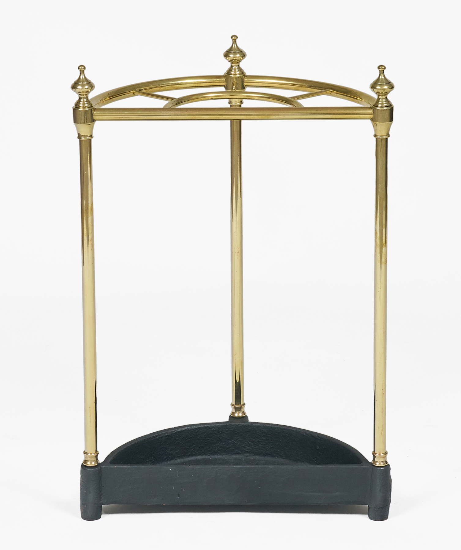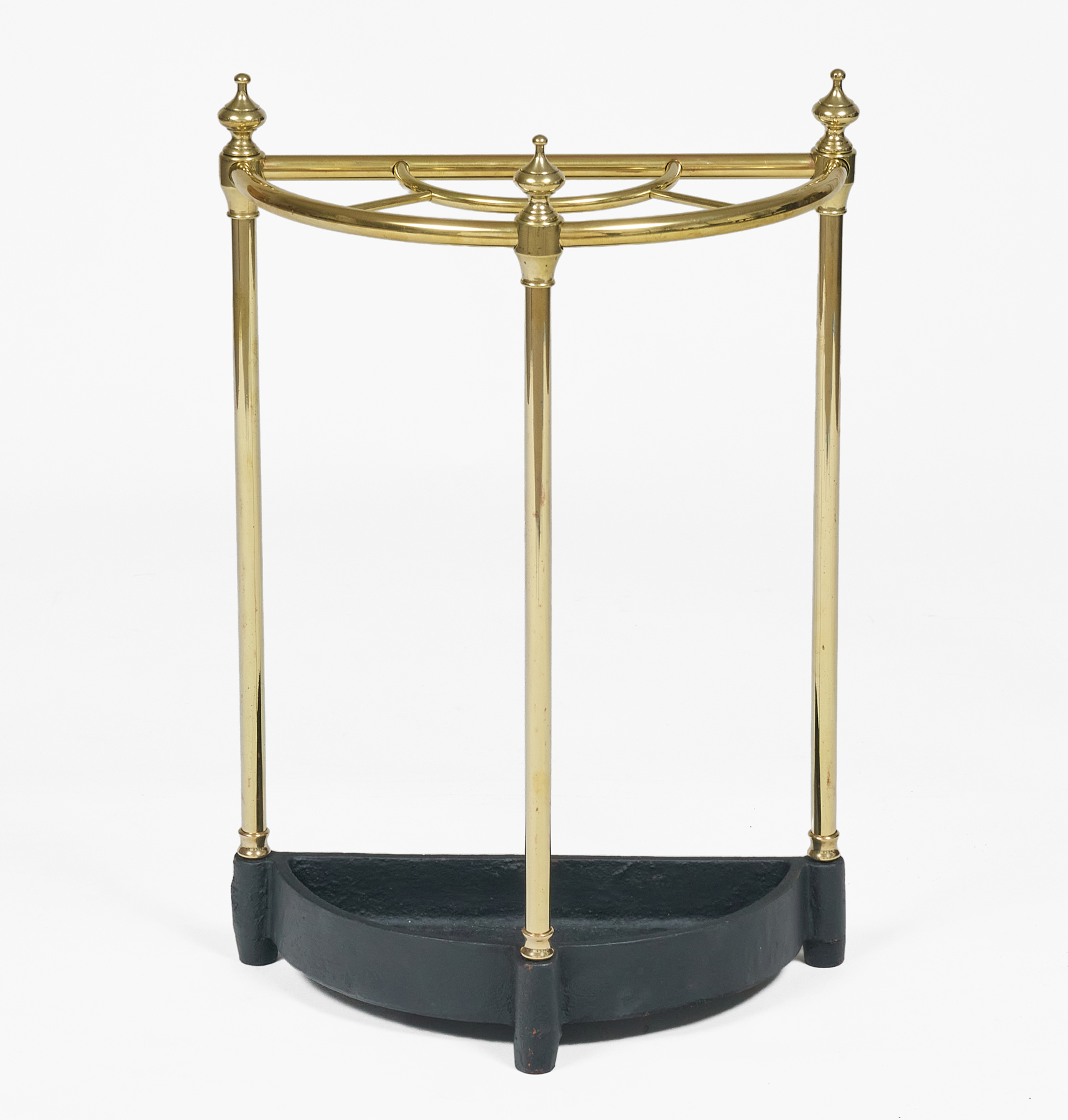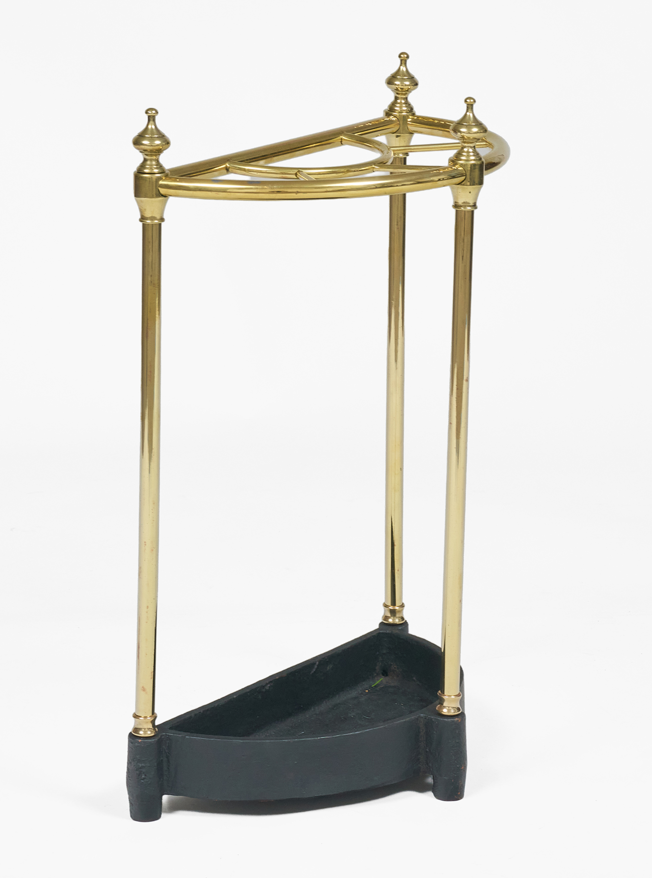 Vintage half-round brass and cast iron umbrella stand, the top divided into four sections with brass finials decorating the three columns.