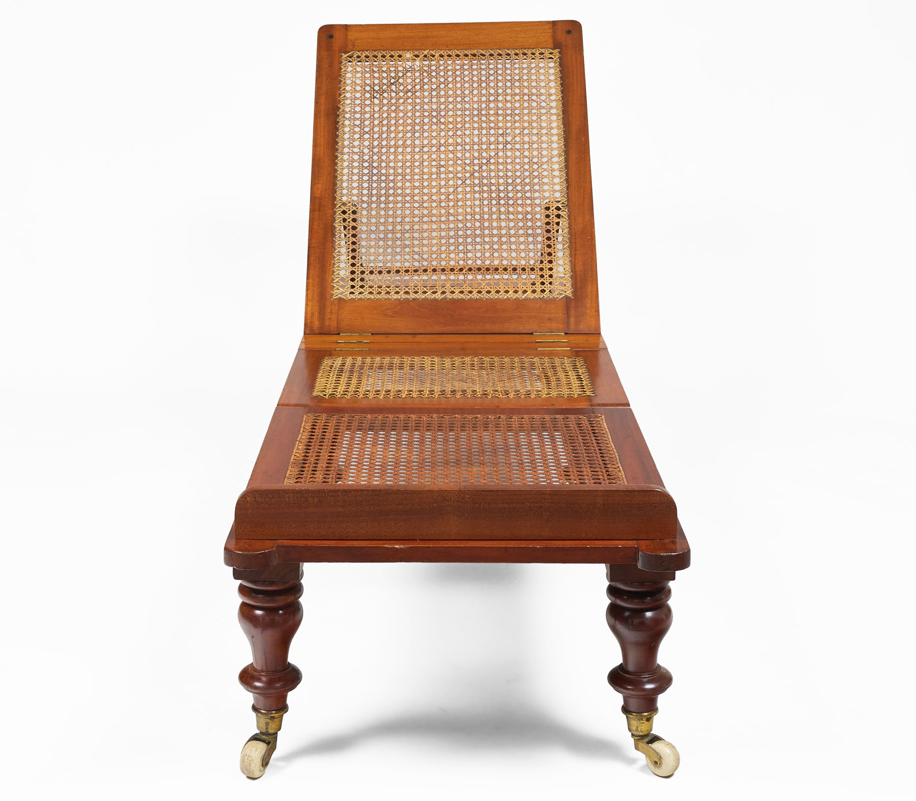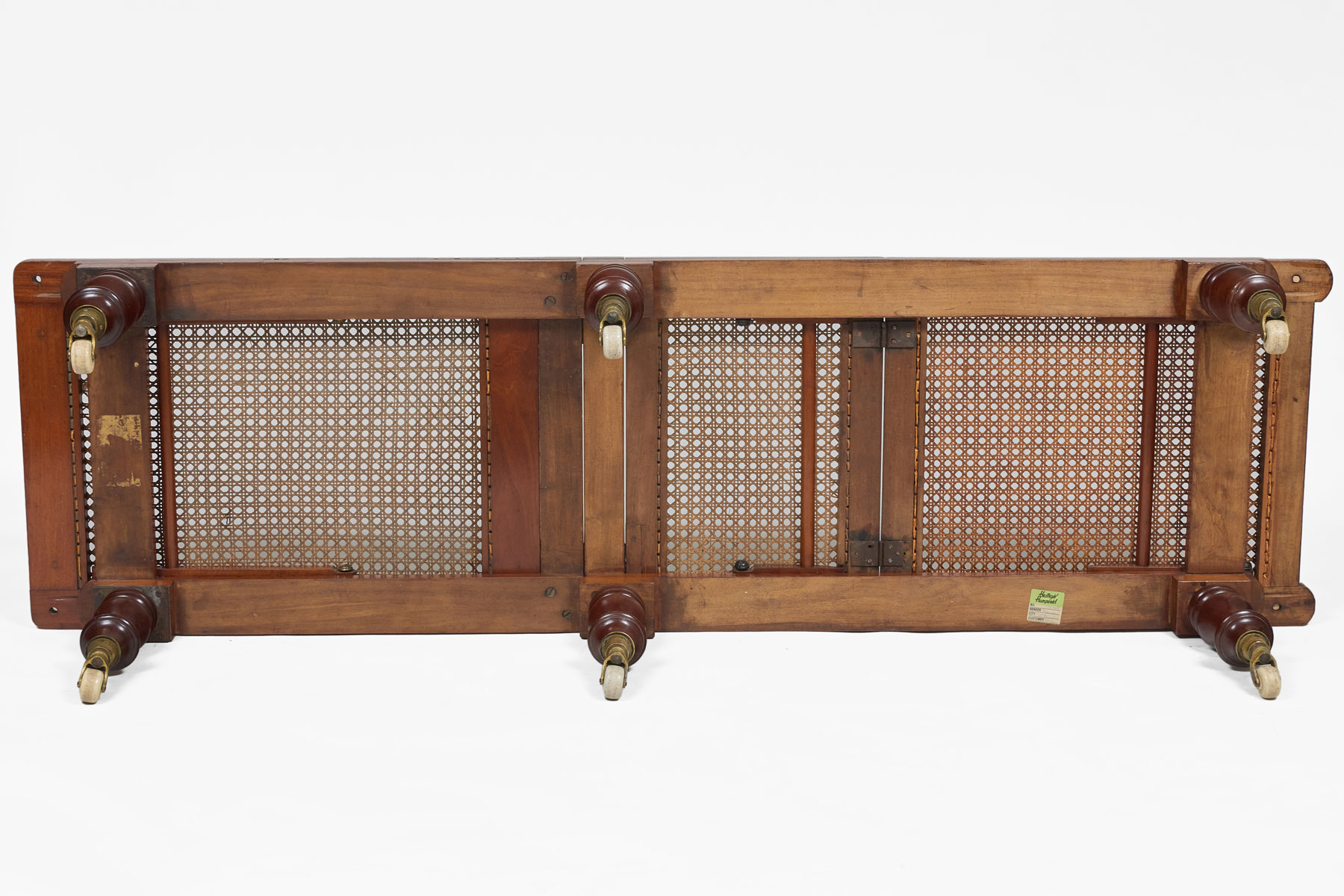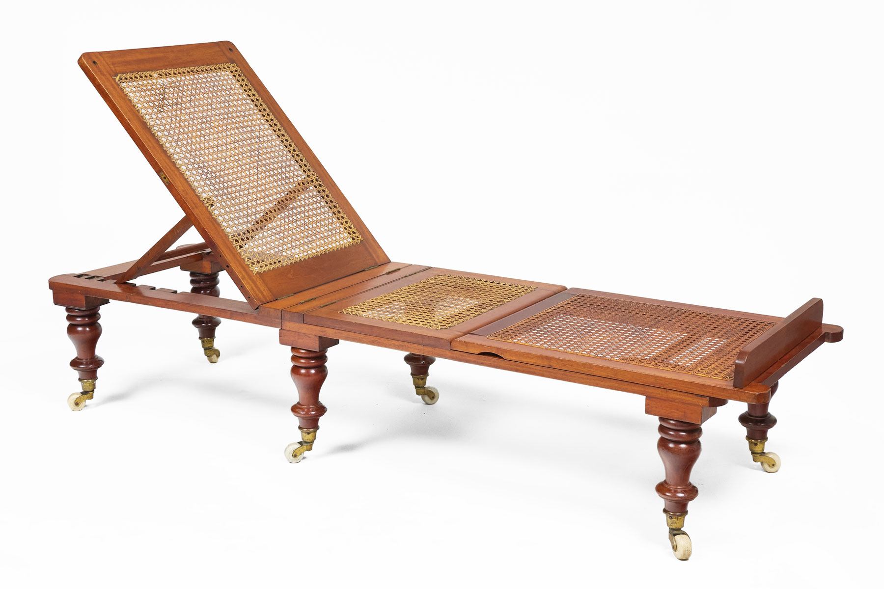 Mahogany campaign folding and adjustable daybed with three caned sections that will adjust their angle on a rachet letting you have a flat bed or raise the back and leg sections to a variety of comfortable positions, supported on turned legs ending with porcelain casters that are stamped Moore Brothers, Birmingham & London Patent. There is a bar at the foot to stop the upholstered cushion from sliding off. It is a very versatile piece of furniture that can be used as a relaxing couch in your den, at camp, at the seaside or on your porch or patio. There is also a very faded label that is illegible, but most likely was made by Robinsons of Ilkley. Under what was the label is the name W. Fawcett.