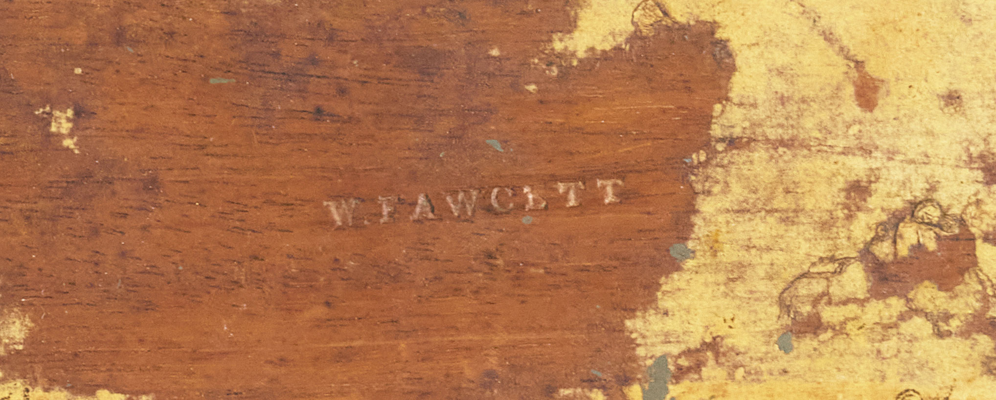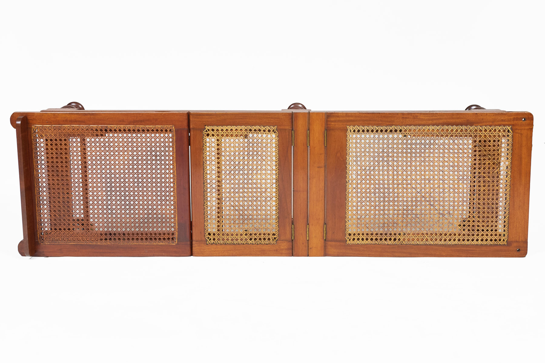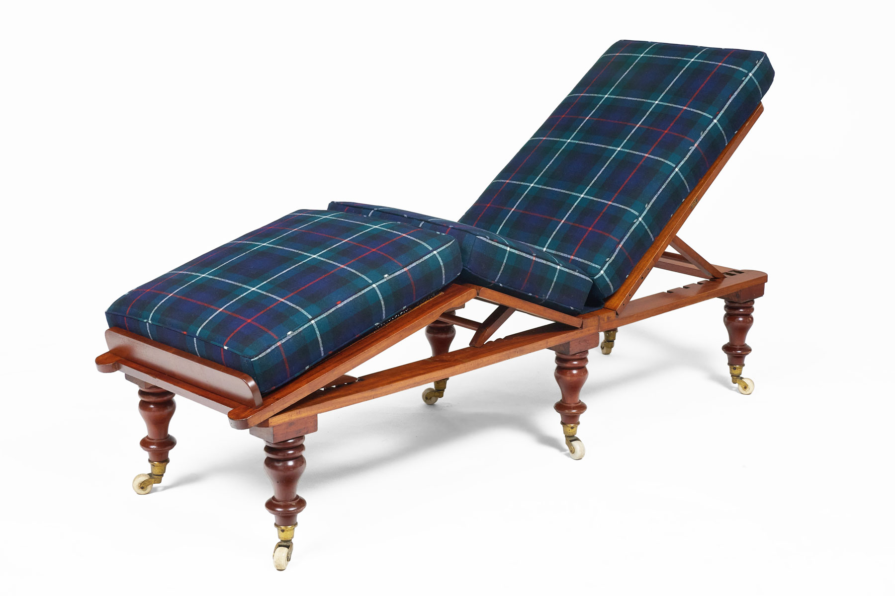 Mahogany campaign folding and adjustable daybed with three caned sections that will adjust their angle on a rachet letting you have a flat bed or raise the back and leg sections to a variety of comfortable positions, supported on turned legs ending with porcelain casters that are stamped Moore Brothers, Birmingham & London Patent. There is a bar at the foot to stop the upholstered cushion from sliding off. It is a very versatile piece of furniture that can be used as a relaxing couch in your den, at camp, at the seaside or on your porch or patio. There is also a very faded label that is illegible, but most likely was made by Robinsons of Ilkley. Under what was the label is the name W. Fawcett.