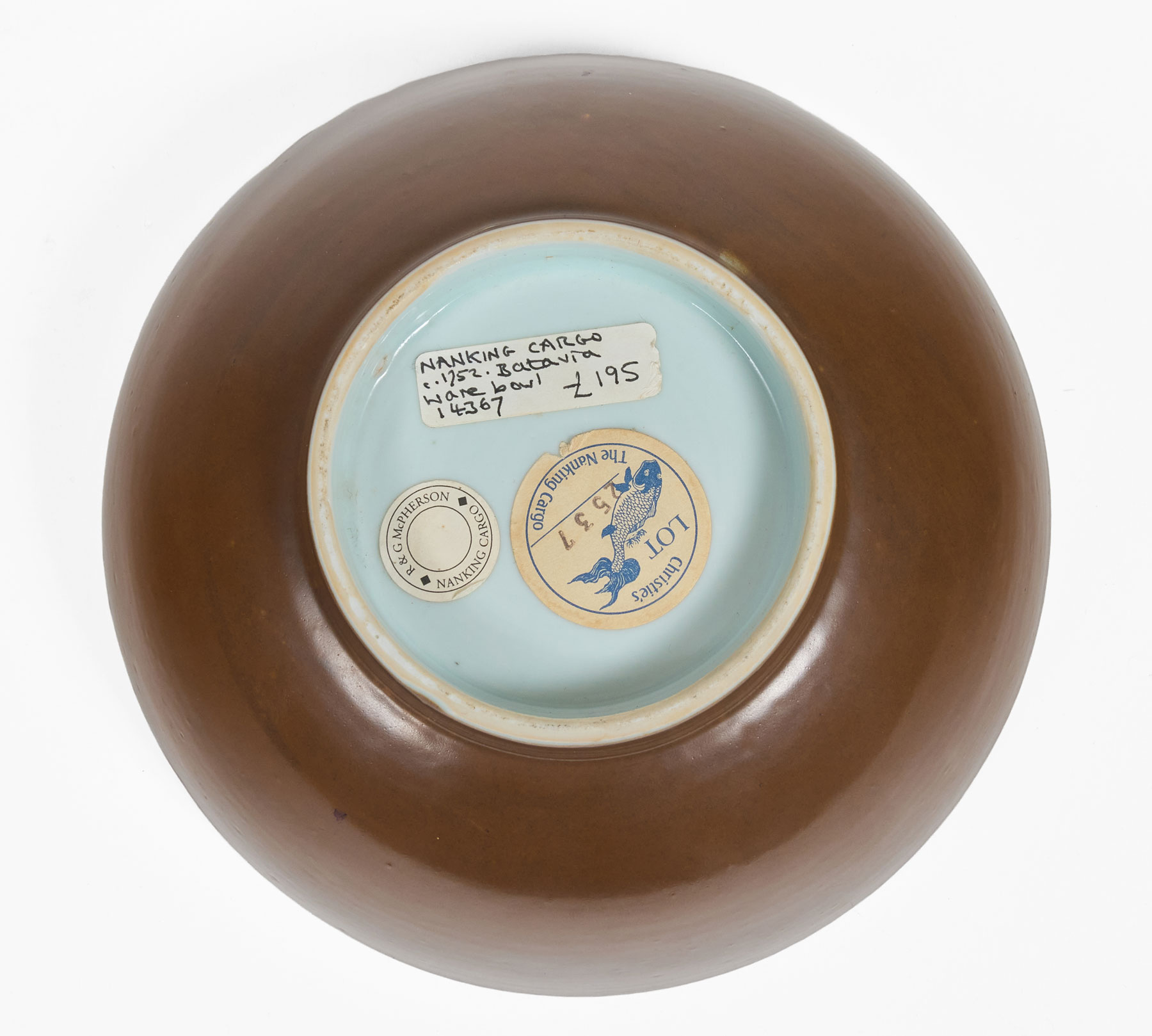 Chinese export Nanking cargo Batavia-ware tea bowl with cafe-au-lait color on the outside. The interior is painted in underglaze blue and depicts a diaper border and chrysanthemums.