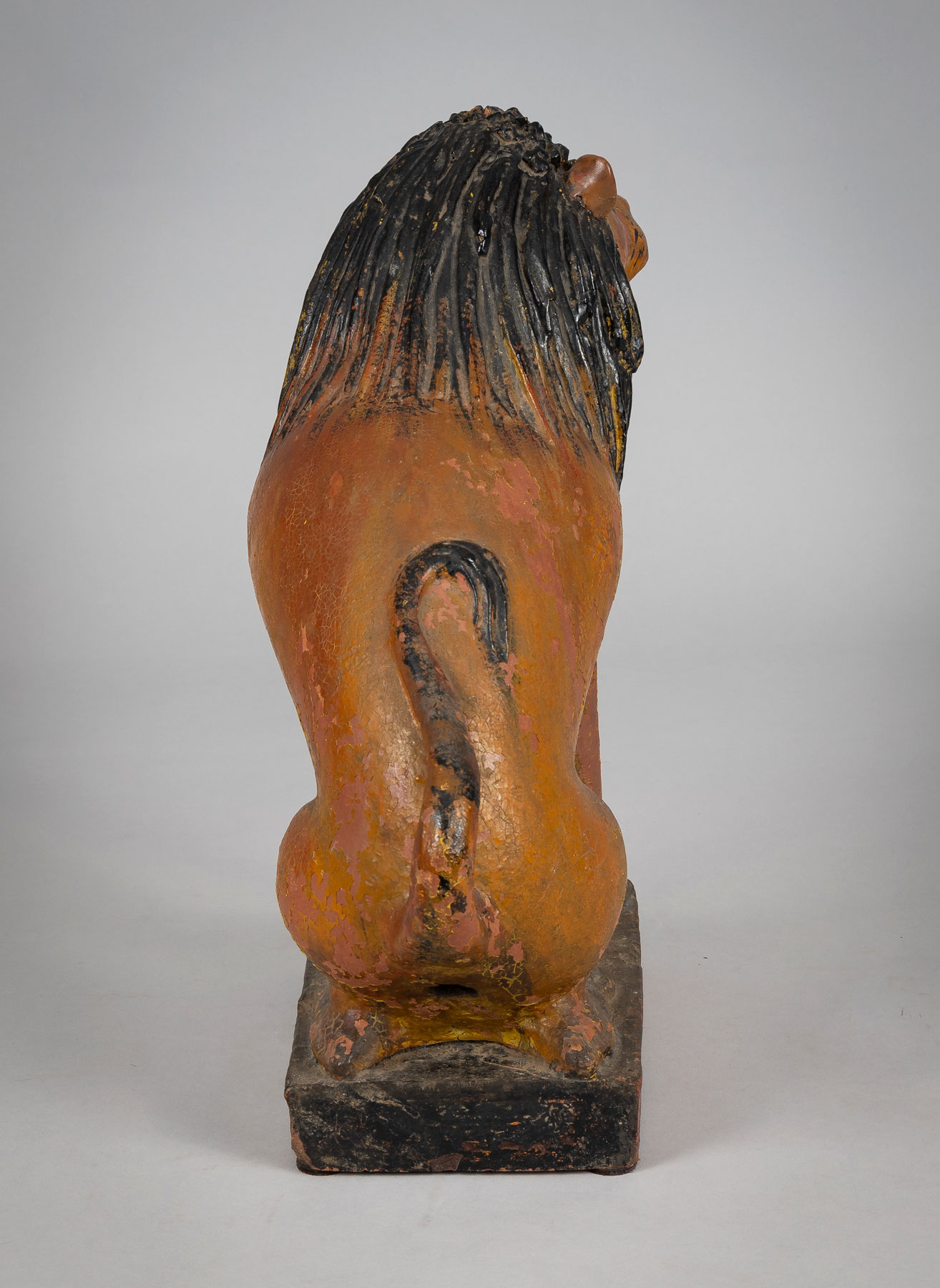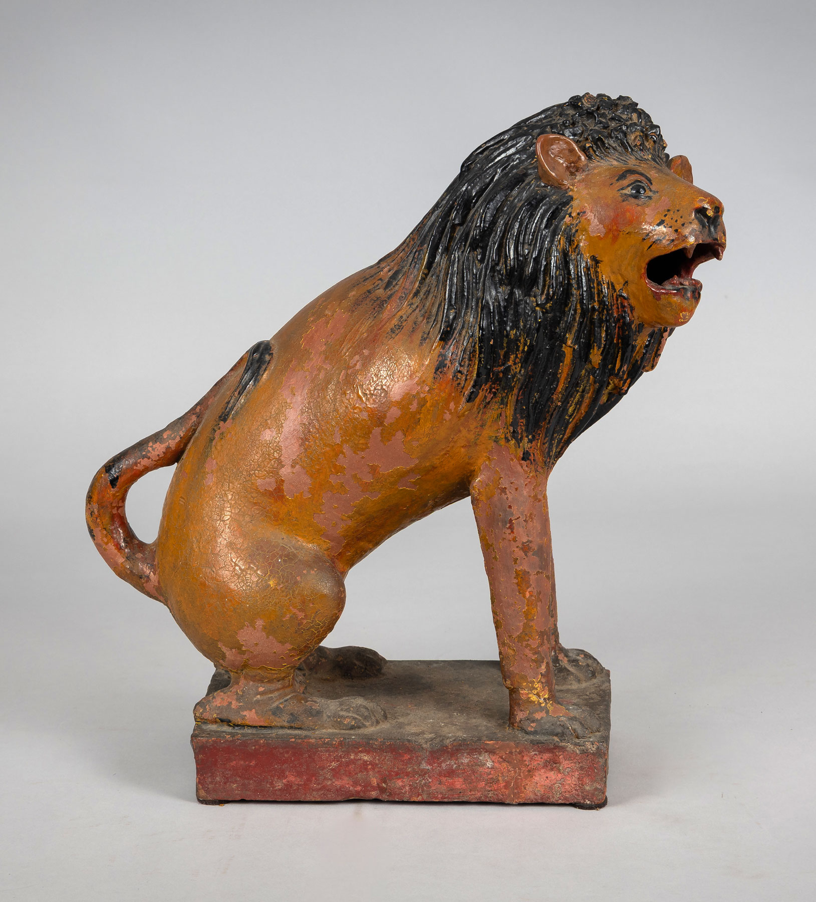 Charming Continental glazed terracotta folk-inspired lion sporting a full black mane, seated on his haunches letting out a ferocious roar, mounted on a plinth base.