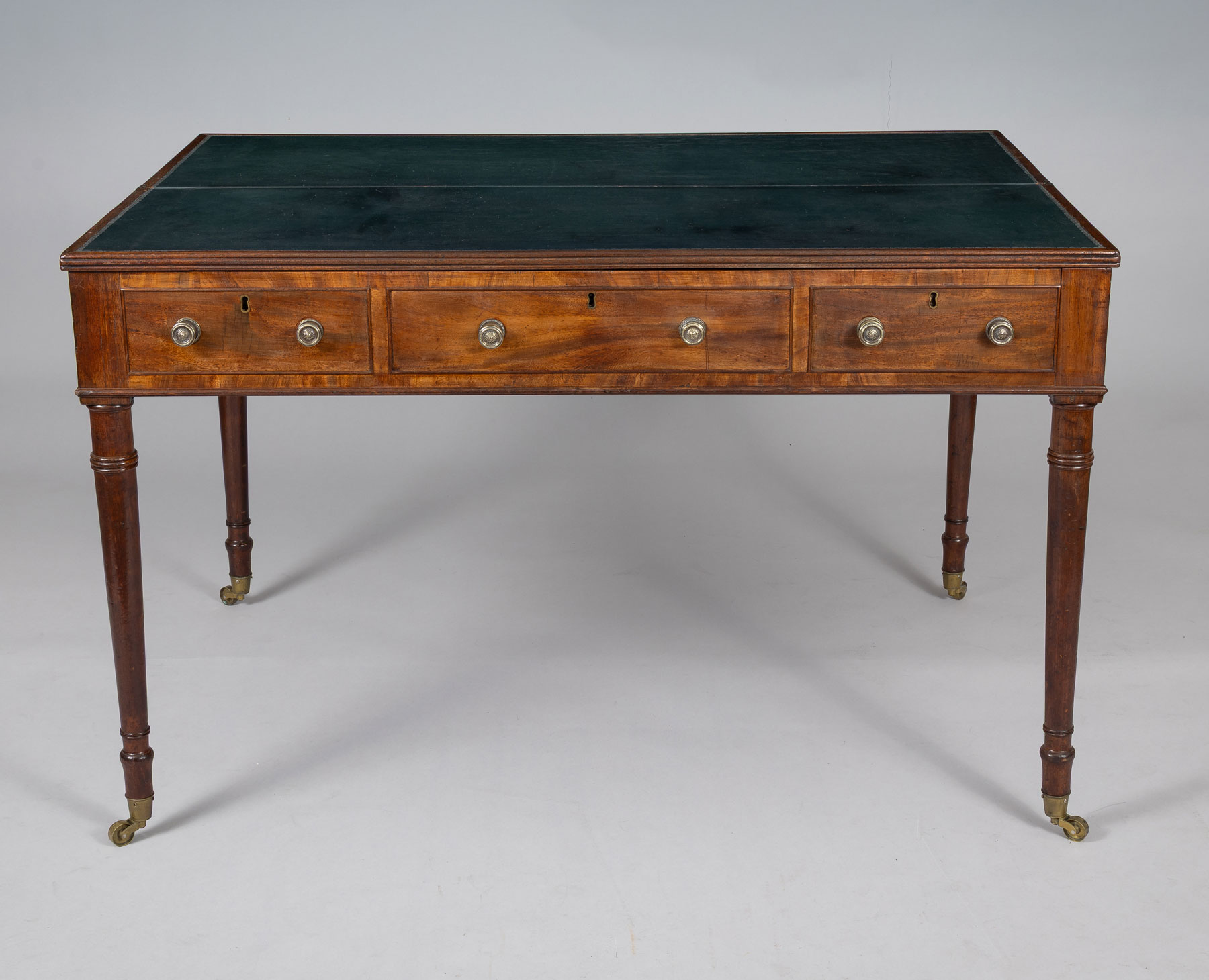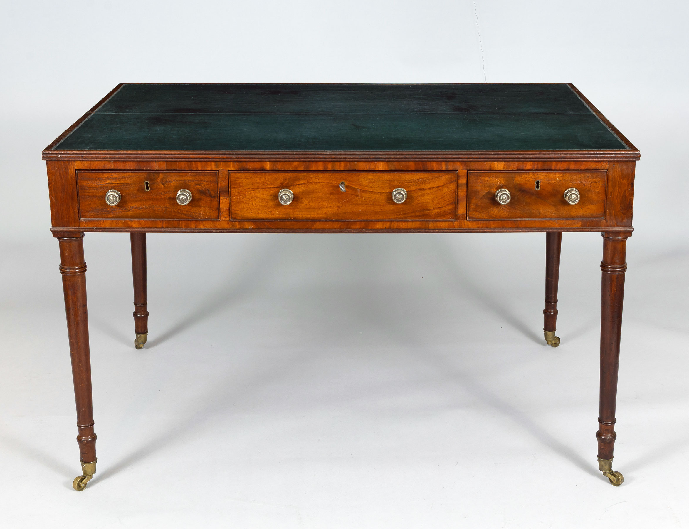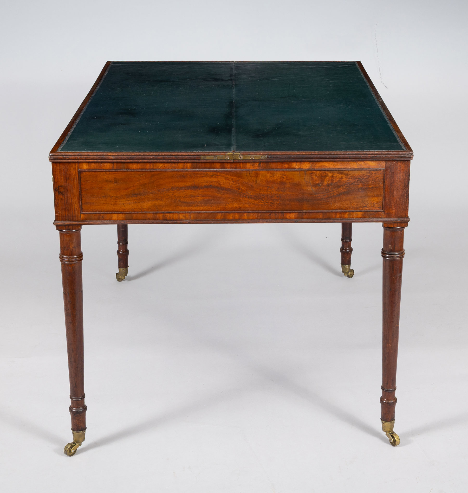 Most unusual, unique and rare 19th Century mahogany writing table, half the top is hinged and opens to reveal seven adjustable compartments, a wooden lever keeps the top in place, bottle-green tooled leather writing surface, three drawers on the front, three faux drawers on the back, round brass knob hardware. The table is mounted on ring turned legs ending in brass casters. It retains the original key.