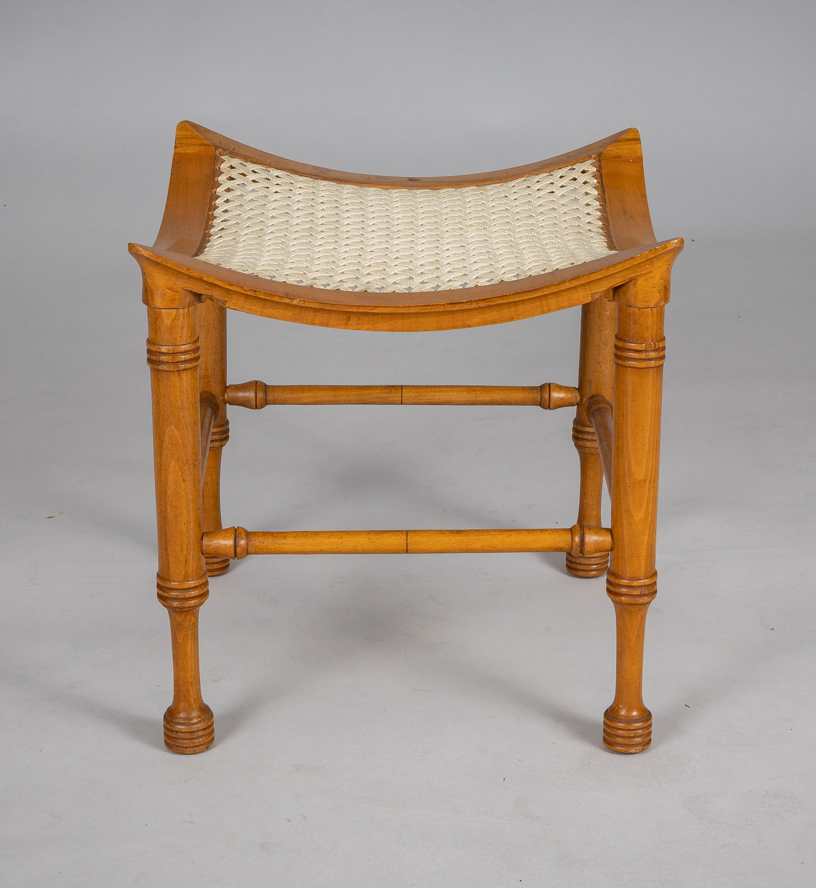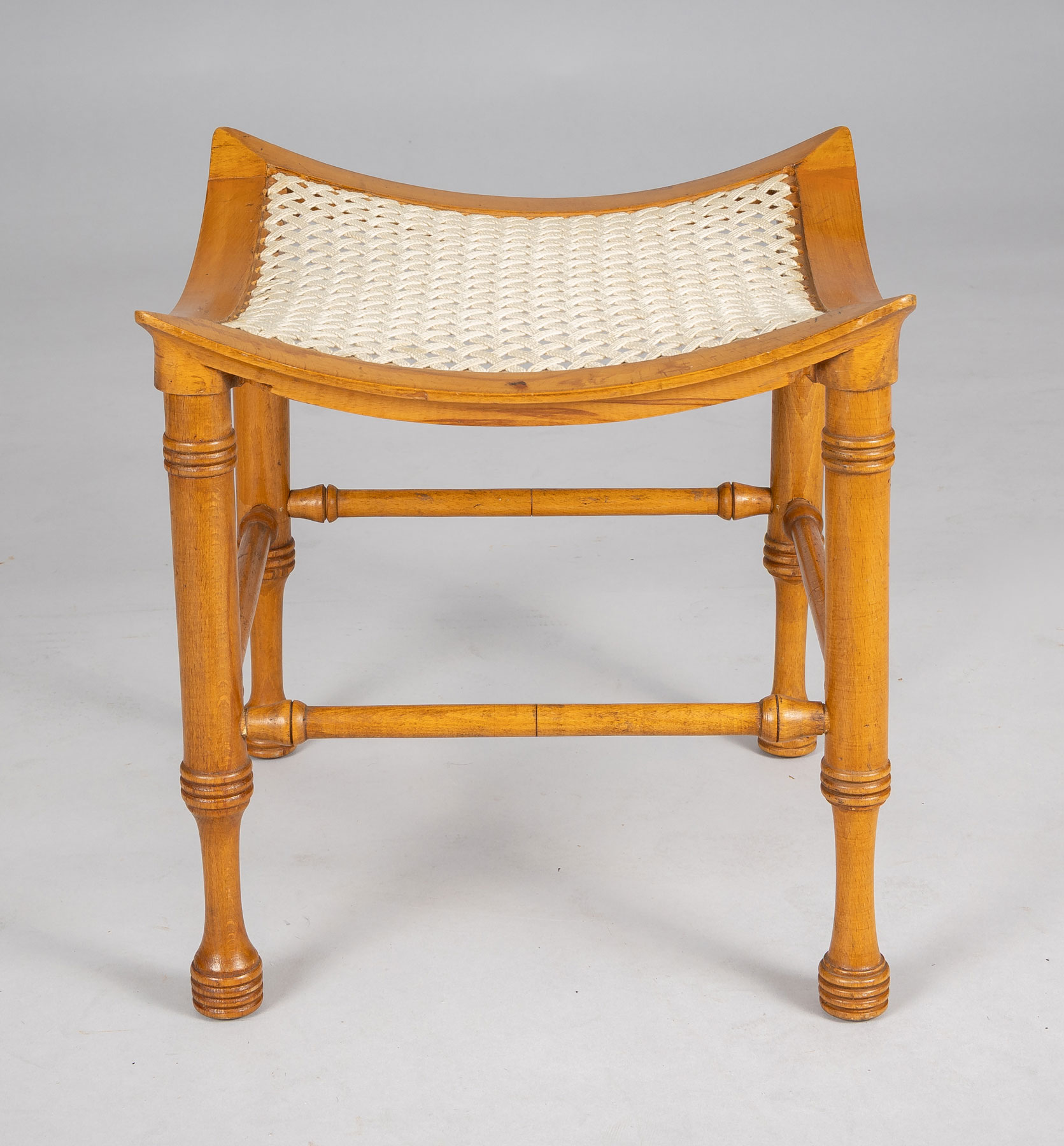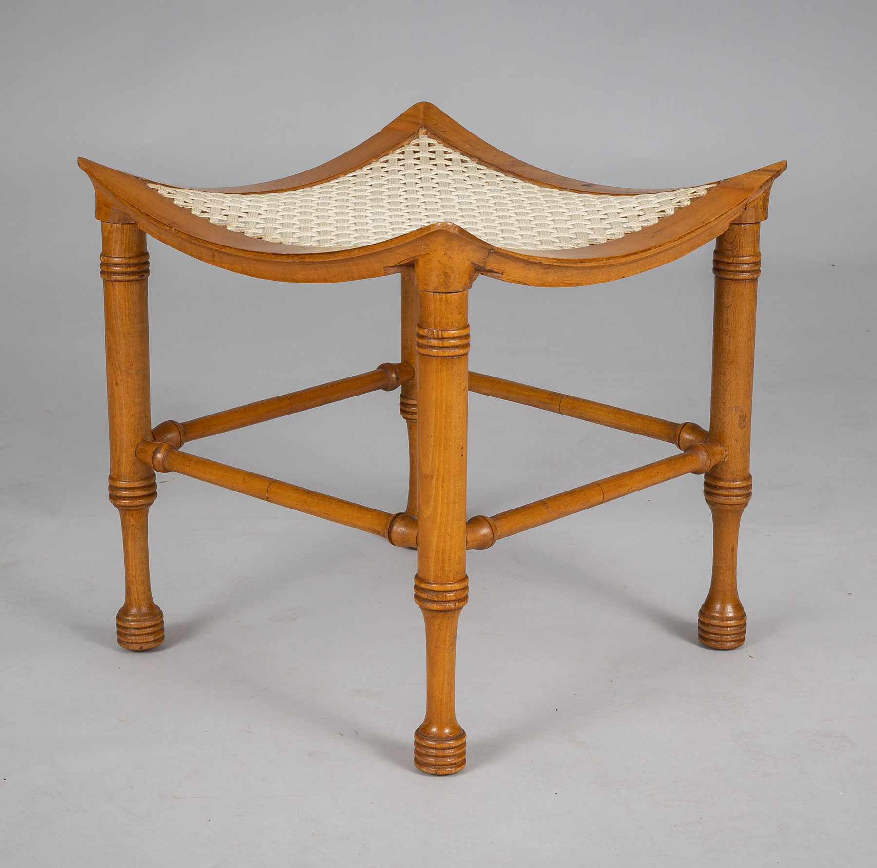 Very simple design of a Egyptian Revival Thebes maple stool with turned legs and four stretchers, the seat of woven cord. Designed originally by Liberty and Co., London.
