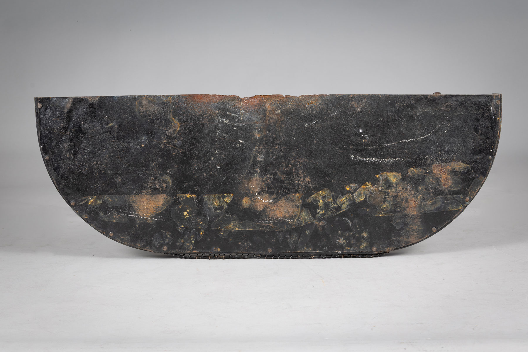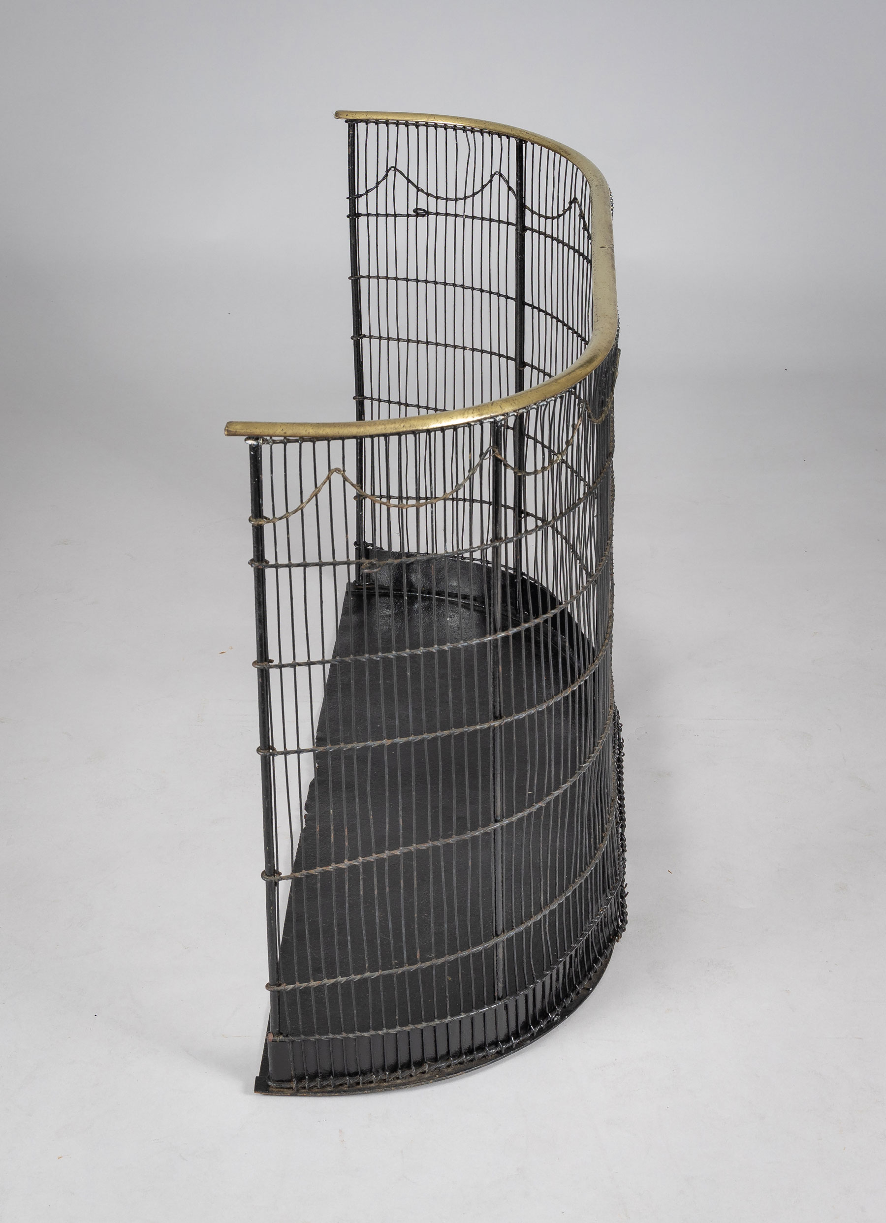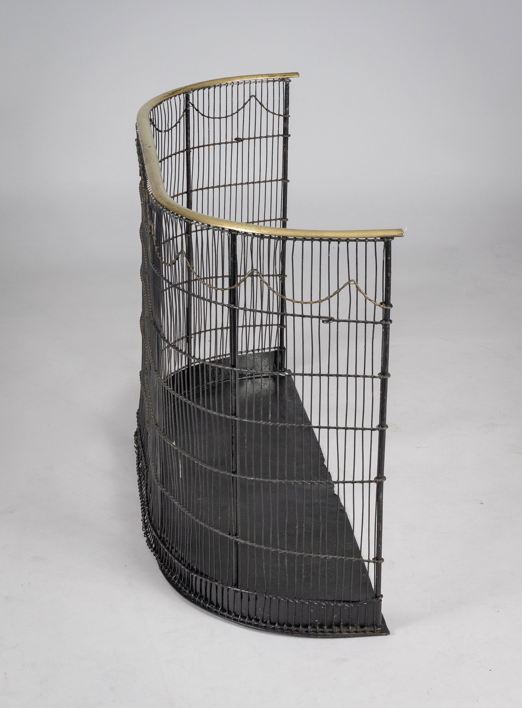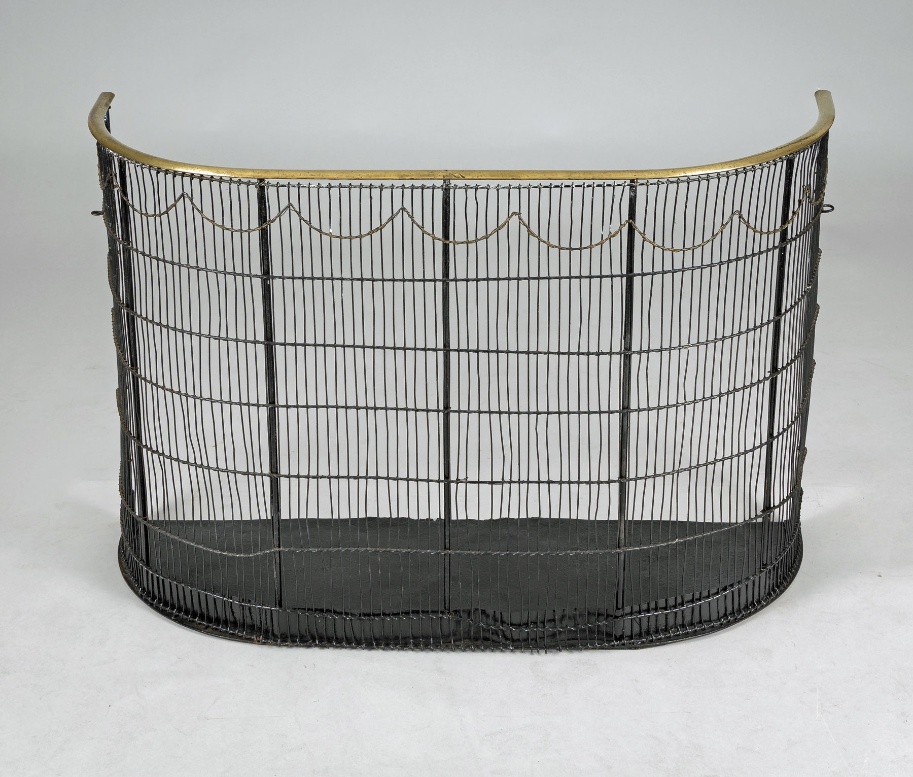 English brass and wire mesh curved nursery fire fender with scalloped wire work, metal base.