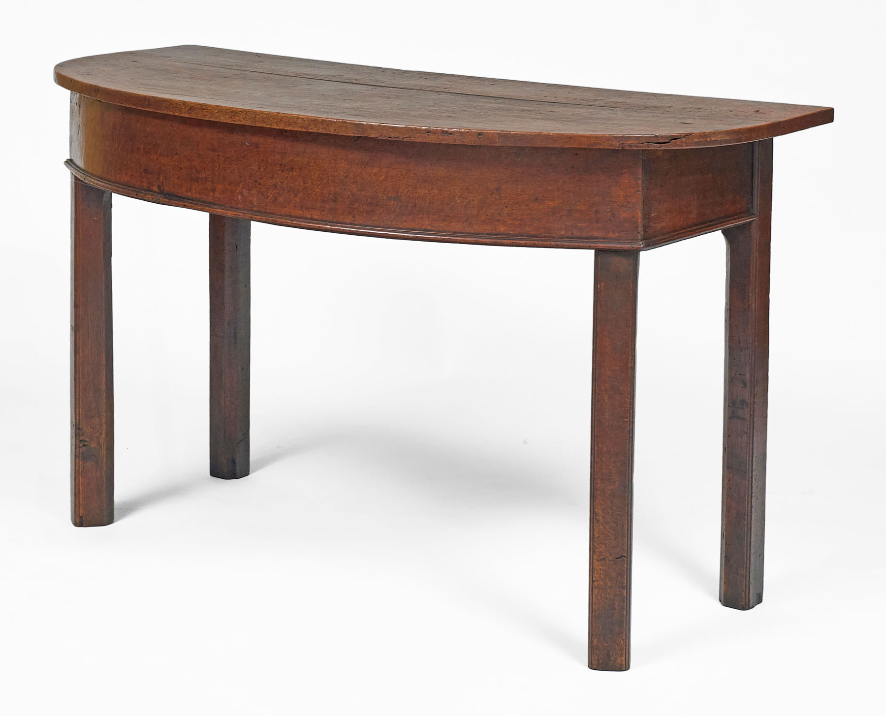 George II black oak D-end table above a bow-front frieze with straight sides is a refined example of mid-18th-century English furniture, combining elegance with restrained craftsmanship. The “D-end” form refers to its semicircular shape—flat at the back so it can sit flush against a wall, with a graceful curved front that creates a soft, architectural presence in a room. This frieze is unadorned except for the molded top edge, emphasizing proportion and line over heavy carving. It has square straight molded legs. The simplicity of the legs allows the curved front to remain the focal point. The table has aged gracefully over the years and has a lovely patina.