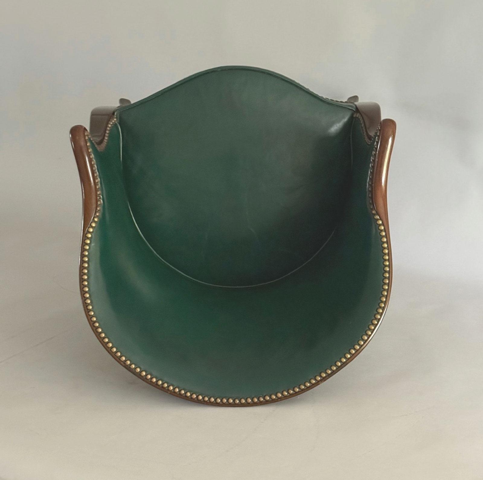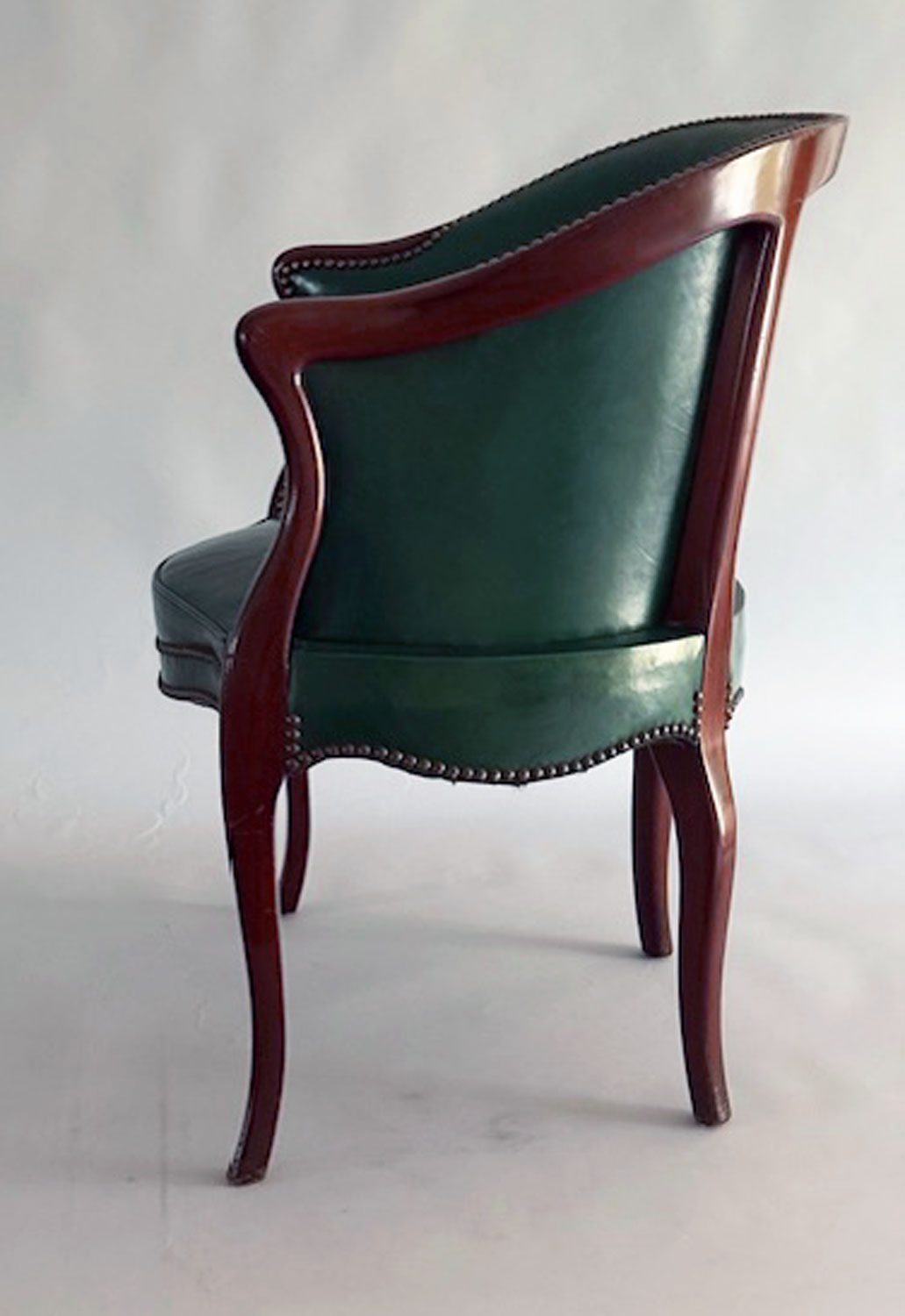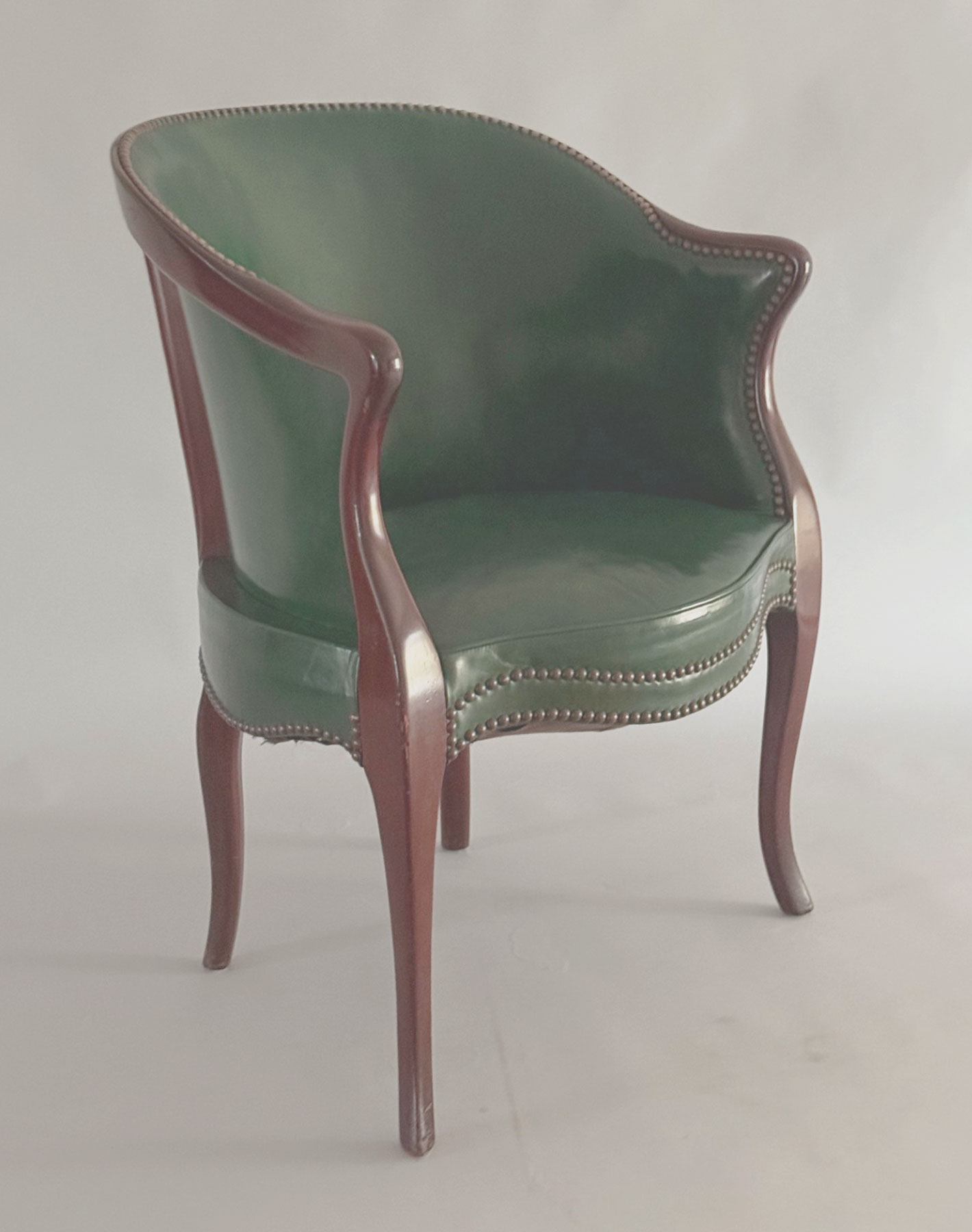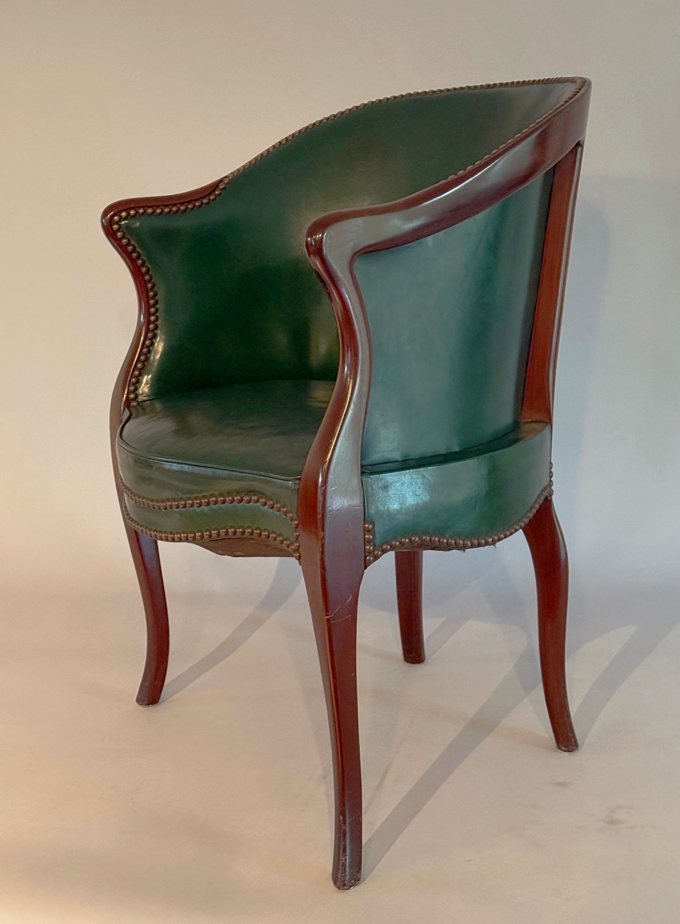 Antique Georgian tub back armchair with a continuous mahogany frame, upholstered in a dark green leather, a serpentine shaped seat with a double row of brass nail heads below the seat and a single row around the frame, raised on shaped legs.