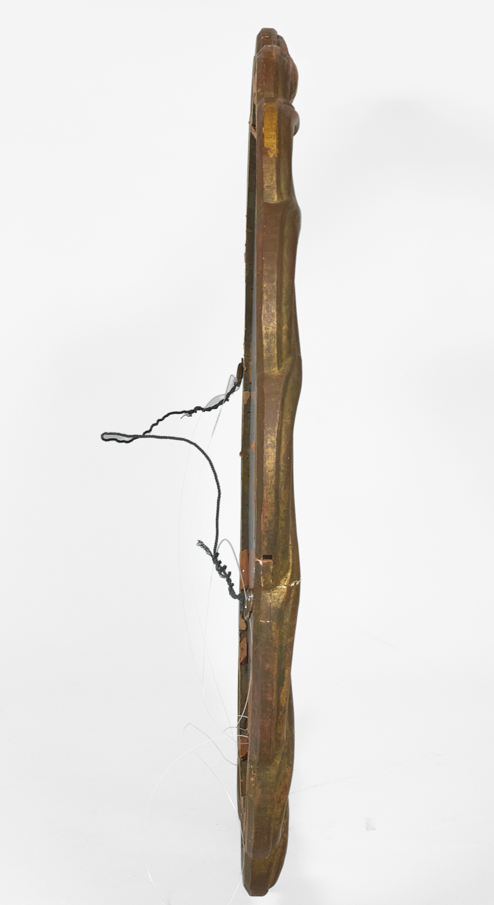 Large oval giltwood mirror, the frame with pierced interlacing ribbons. The gilding, slightly mellowed with age, settles into the recesses of the carving, accentuating the depth and texture of the design and lends the mirror an air that is both elegant and inviting. The mirror plate has been replaced. Since the mirror is oval, it can be hung either vertically or horizontally.