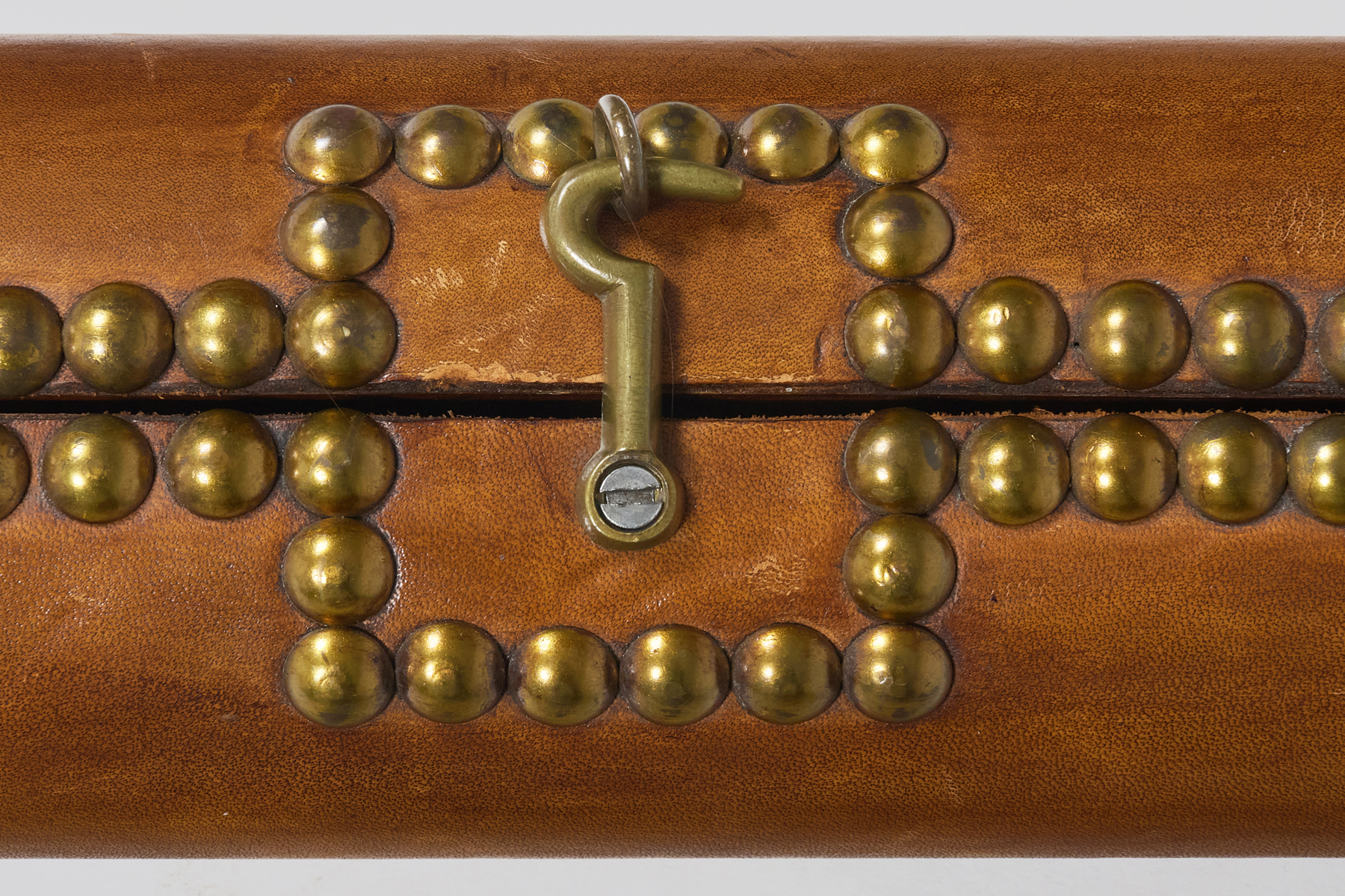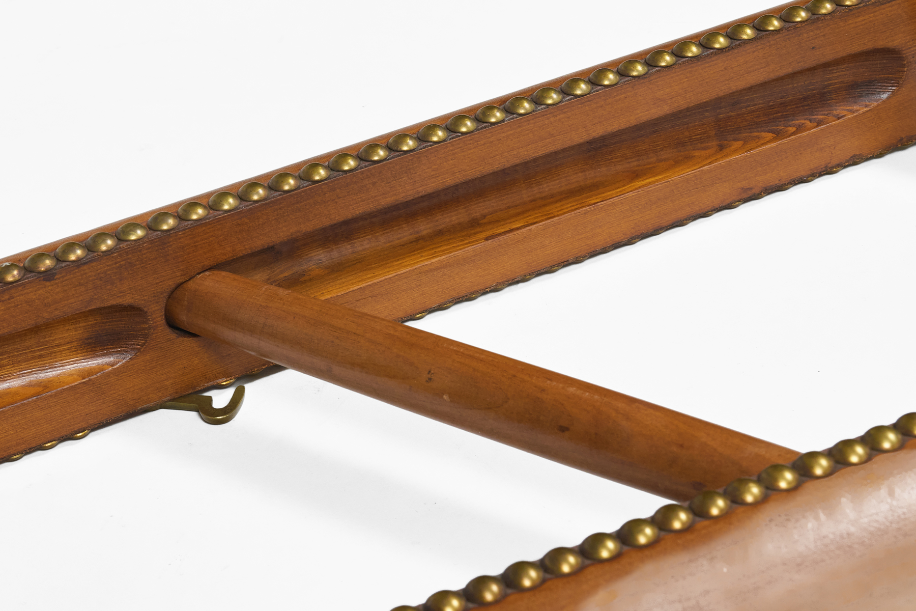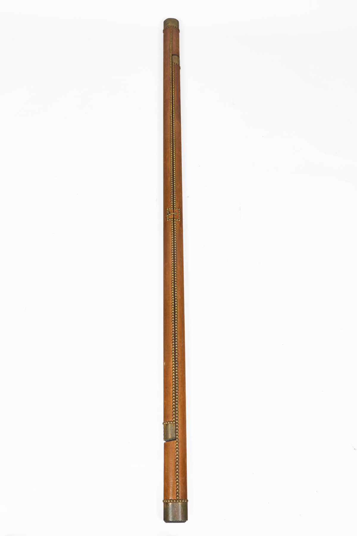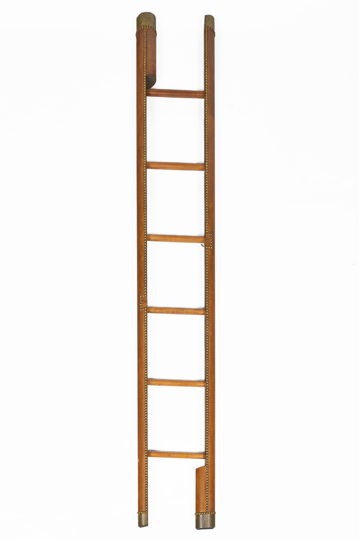 English antique collapsible library pole ladder covered in a luggage colored leather with evenly spaced brass nail heads. These nail heads serve both a functional and decorative purpose: securing the leather while adding a rhythmic metallic accent. There are six rungs. The combination of leather and brass gives the ladder a luxurious, old-world feel—like a classic gentleman’s study.