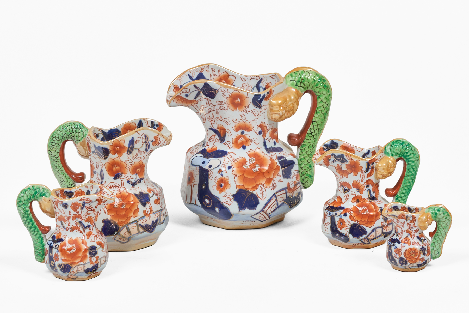 An antique set of five Mason’s Ironstone graduated Hydra jugs in bold Imari colors of cobalt blue and orange with a green serpent shaped handle. Mason’s logo is on the bottom of each jug in blue and bears the inscription ‘Masons Patent Ironstone China.’