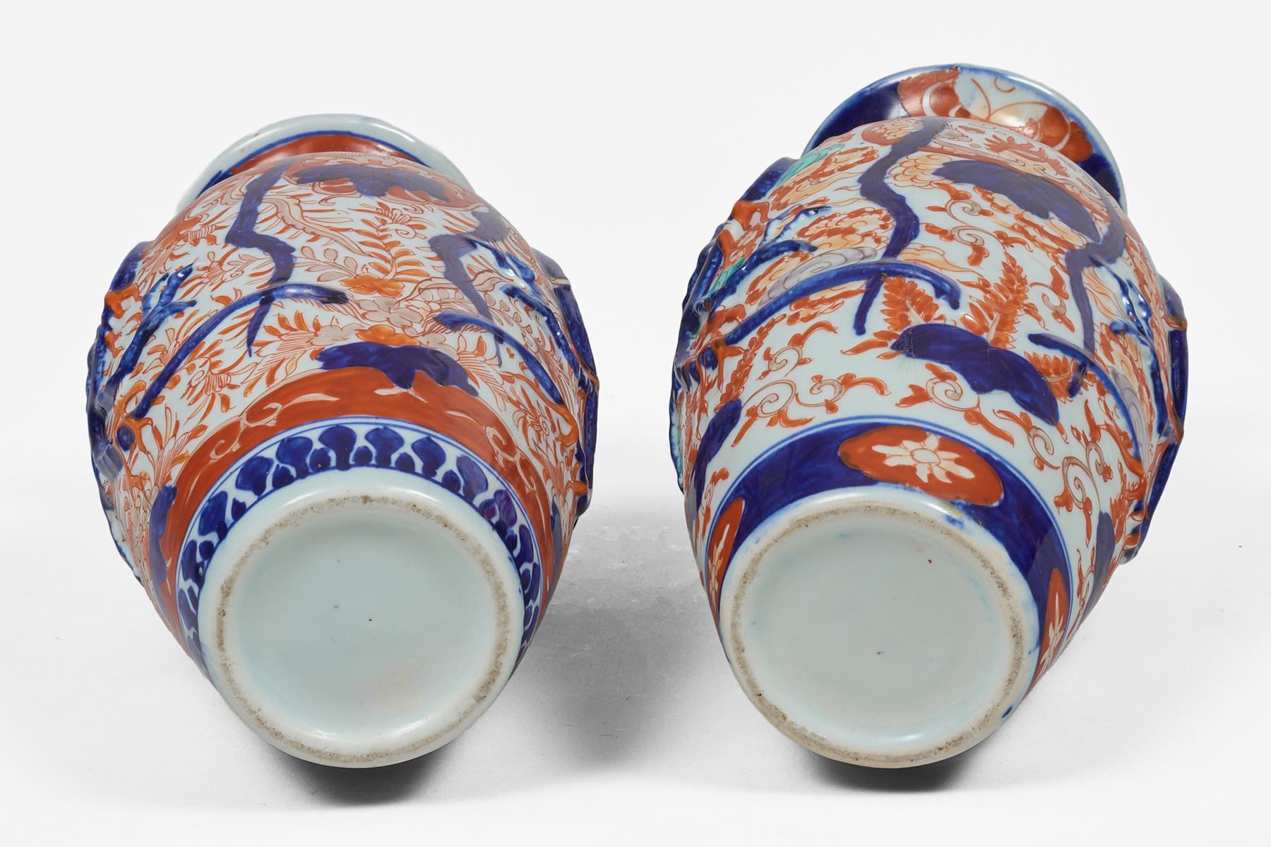 A small pair of Imari baluster shaped vases with flared necks decorated with boldly colored cobalt blue dragons, iron rust and green designs.