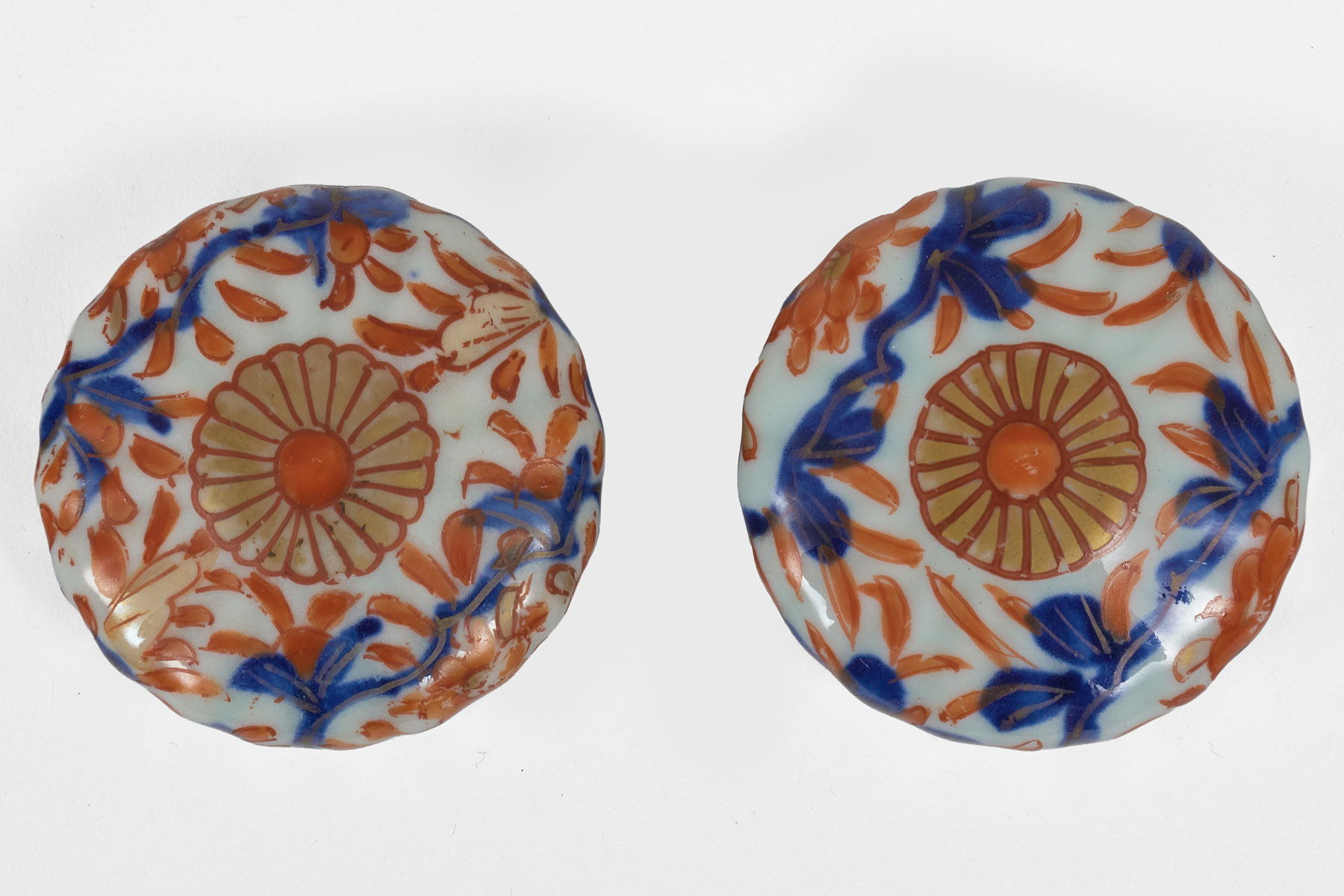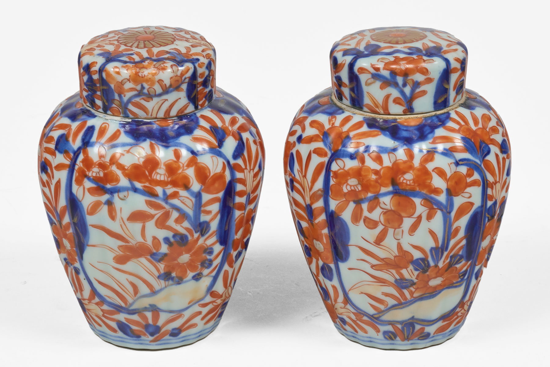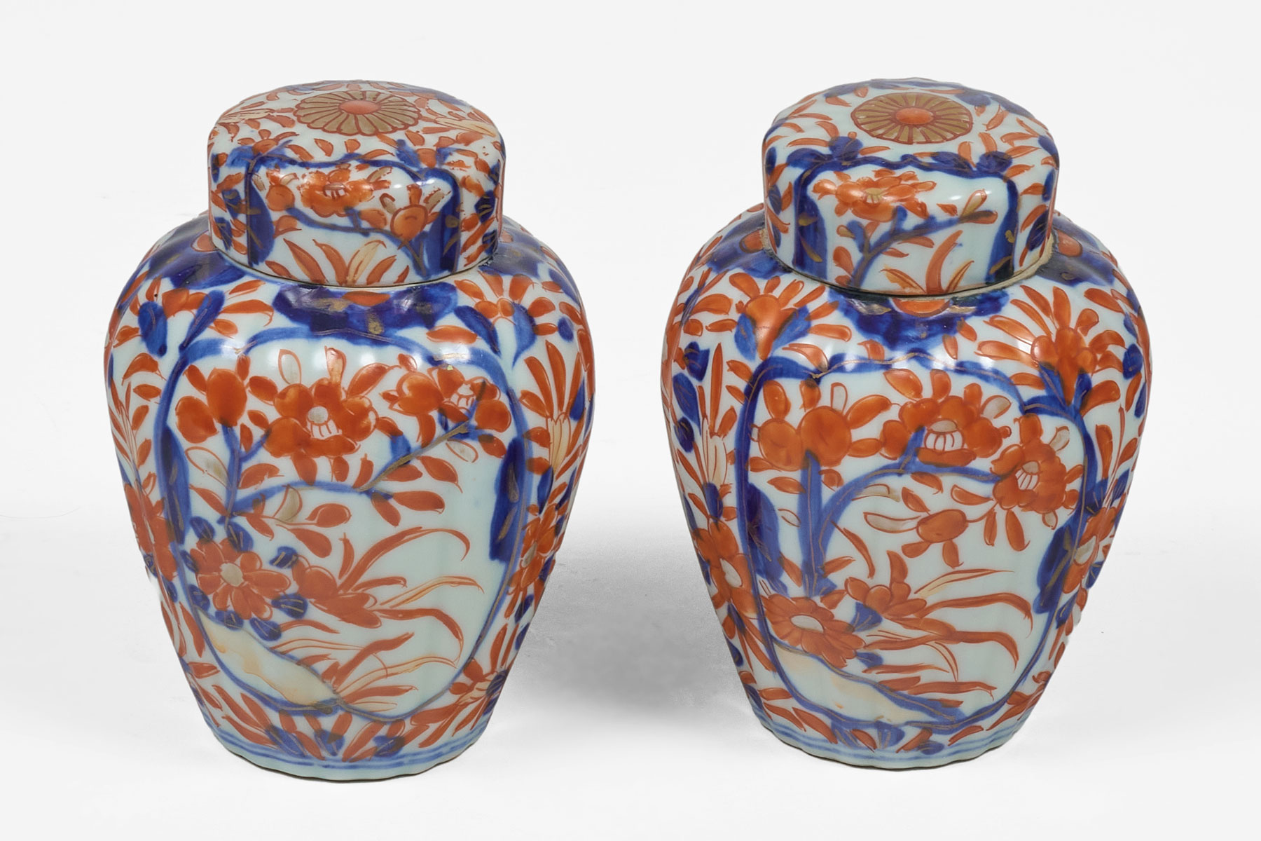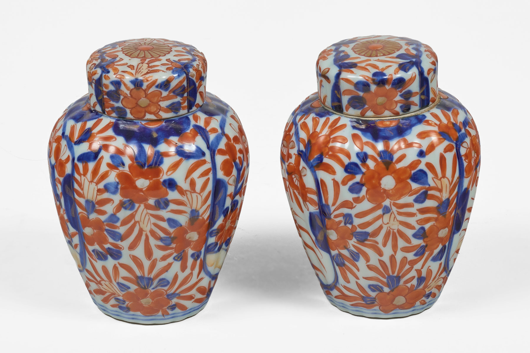 A charming pair of small 19th Century Imari vases with original flat covers, lobed sides, decorated in the usual colors of rust orange and cobalt blue. The lid with a stylized chrysanthemum in the center.