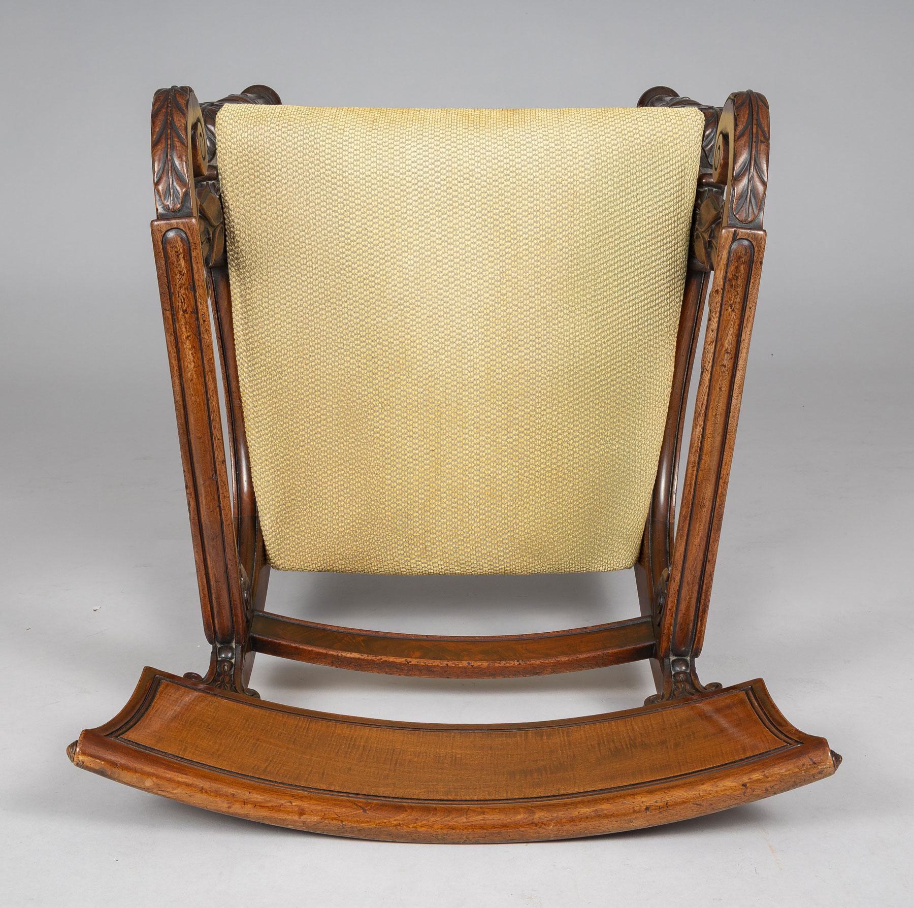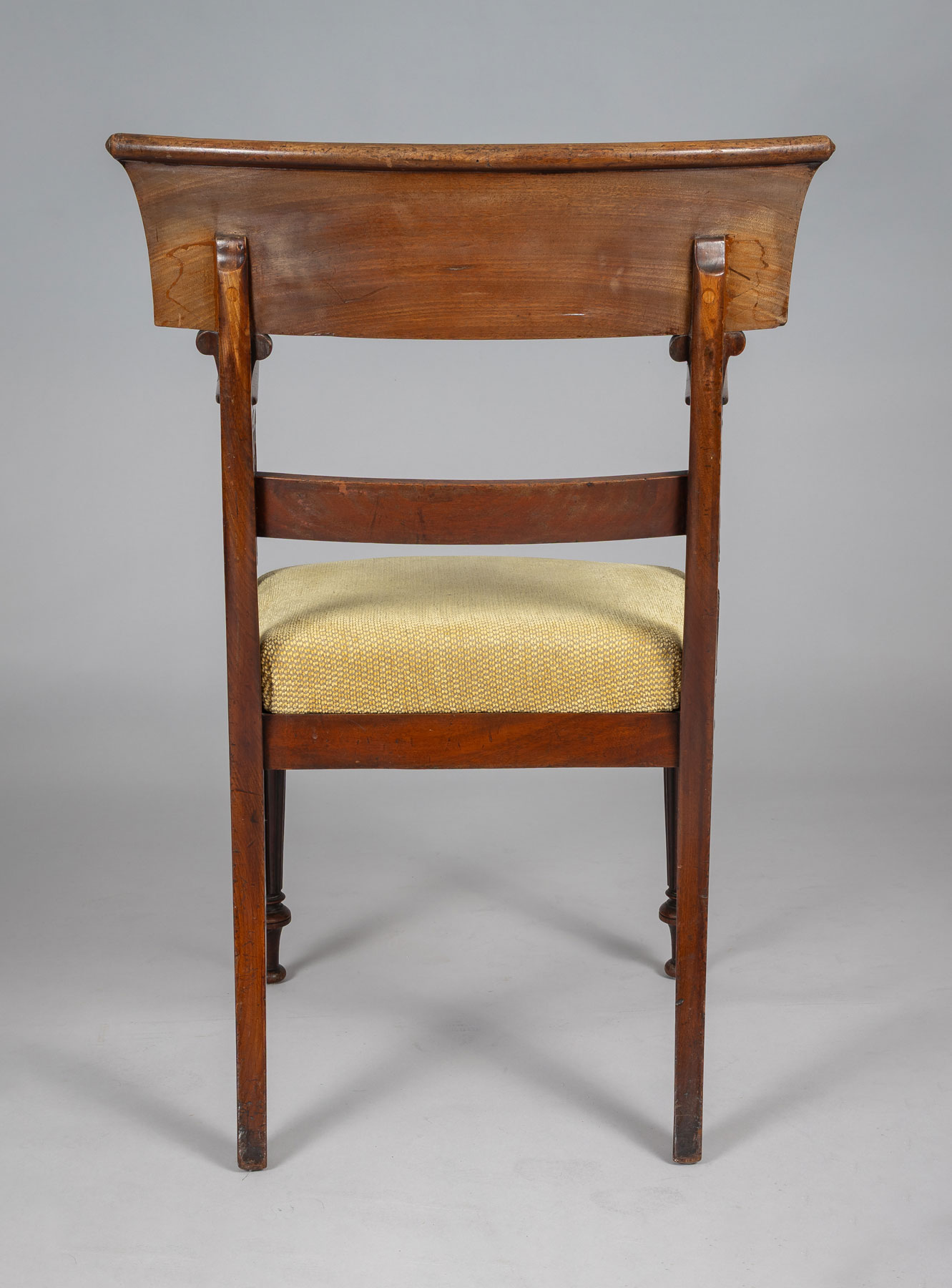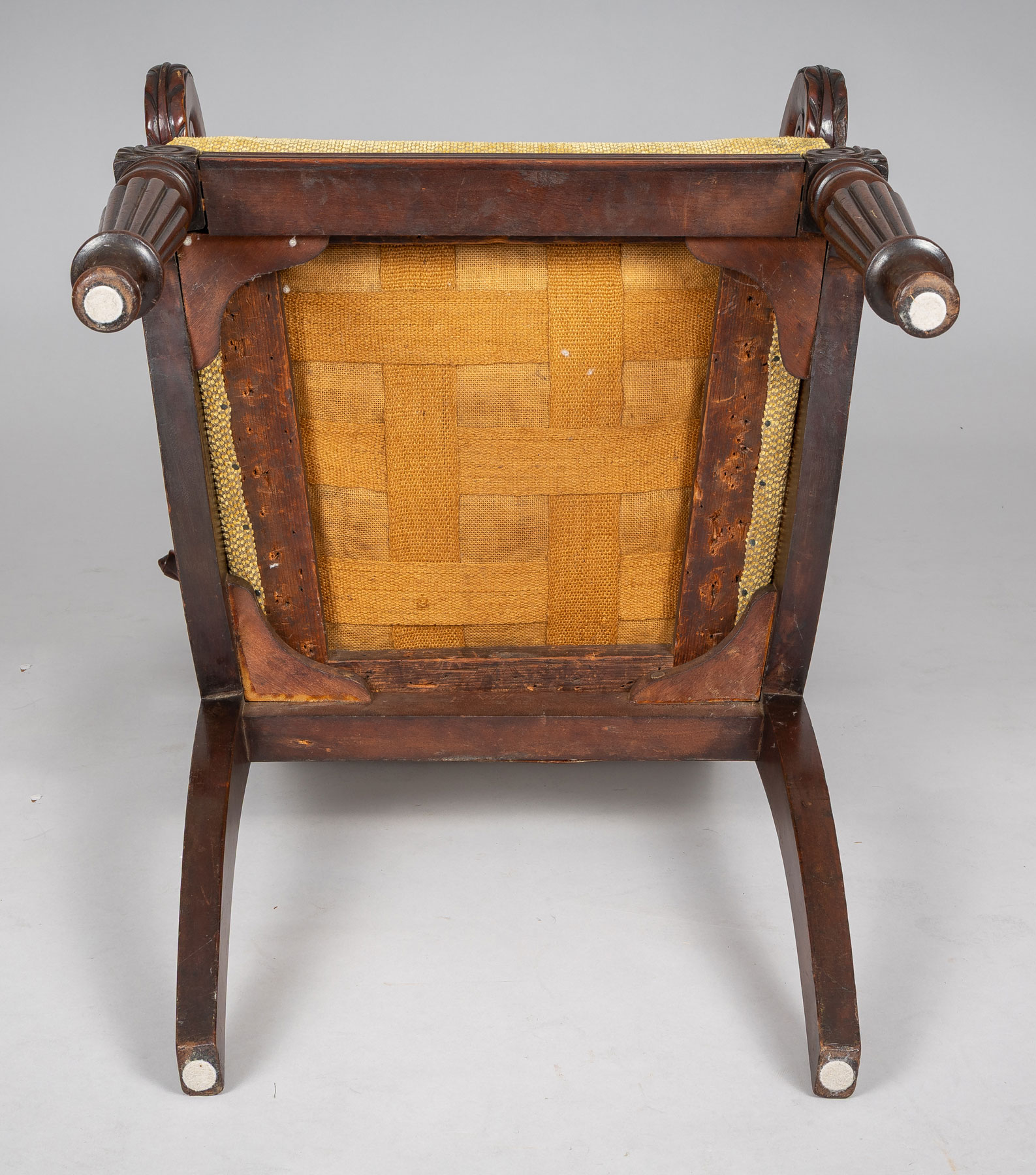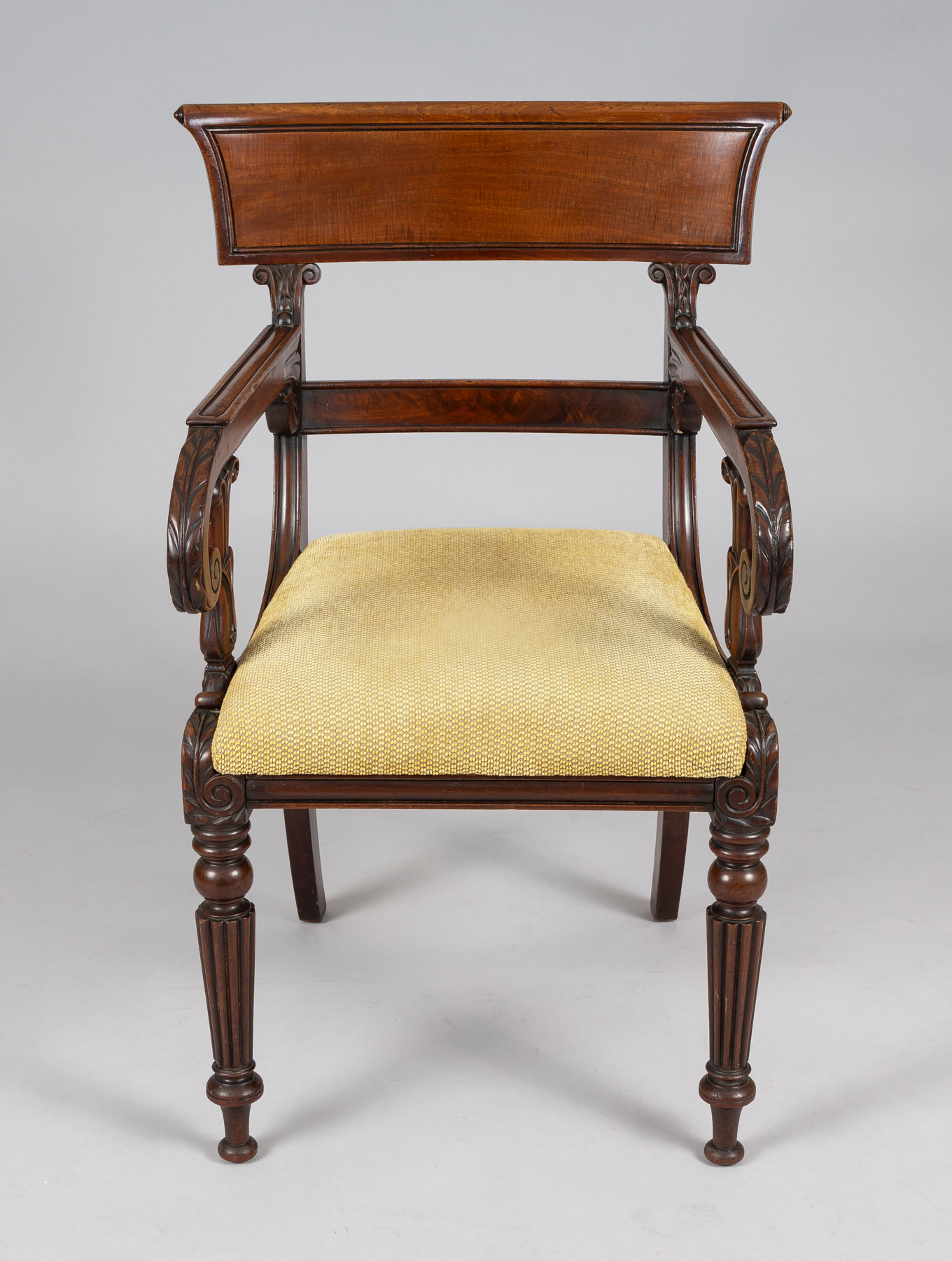 Antique Regency mahogany open frame desk armchair with shaped deep top rail, center splat, heavily carved acanthus leaf scroll arm rests, carved arm supports, tapering turned and reeded front legs ending in bun feet, splay back legs, drop-in seat upholstered in woven golden fabric in excellent condition.