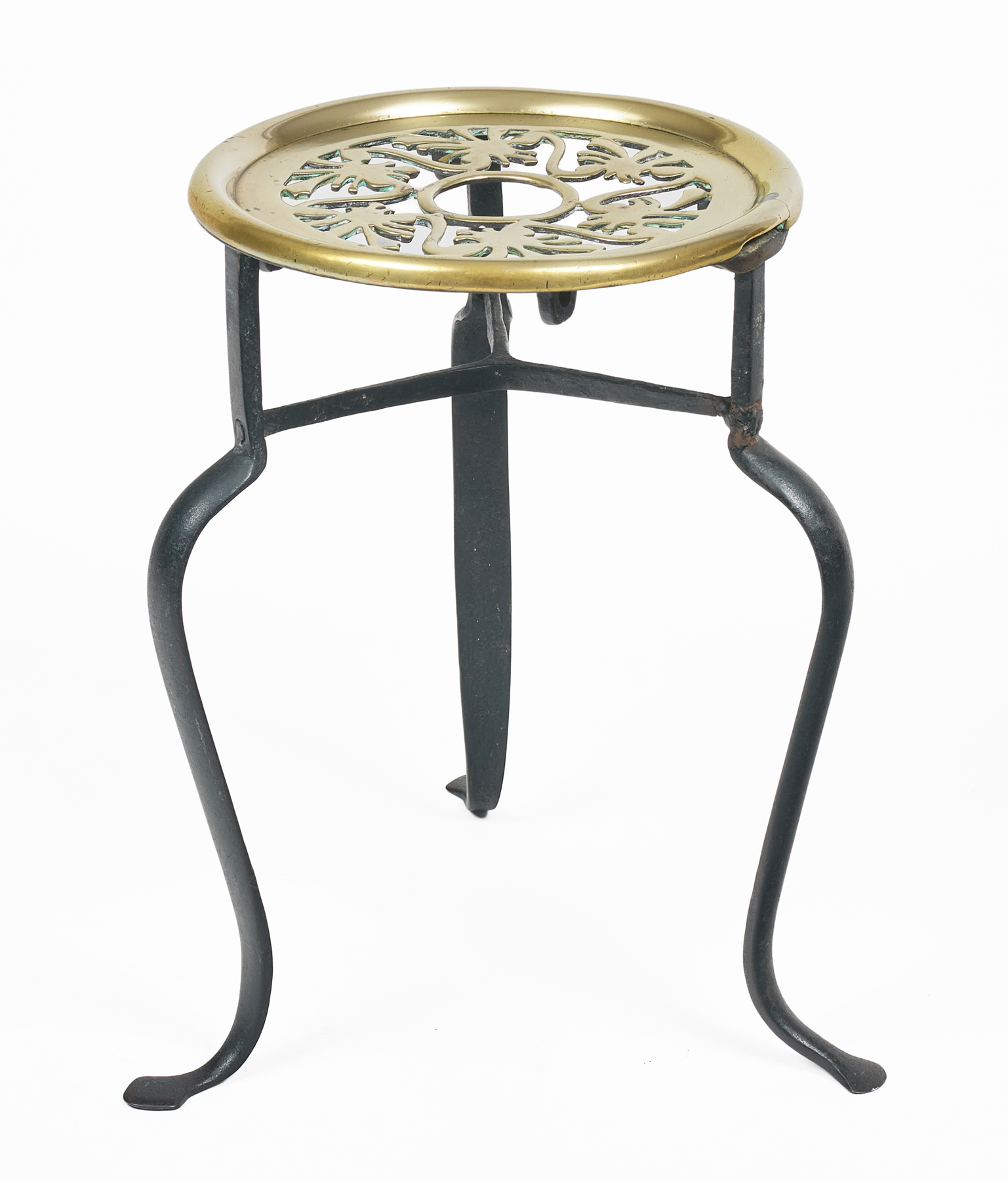 Victorian brass and iron trivet with pierced round top mounted on tall black cabriole shaped legs and penny feet.