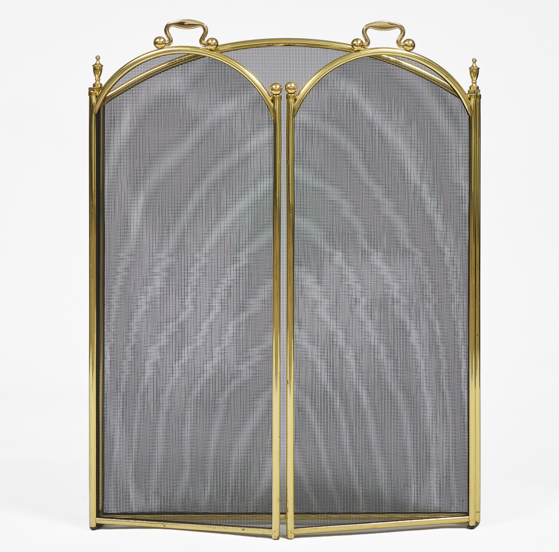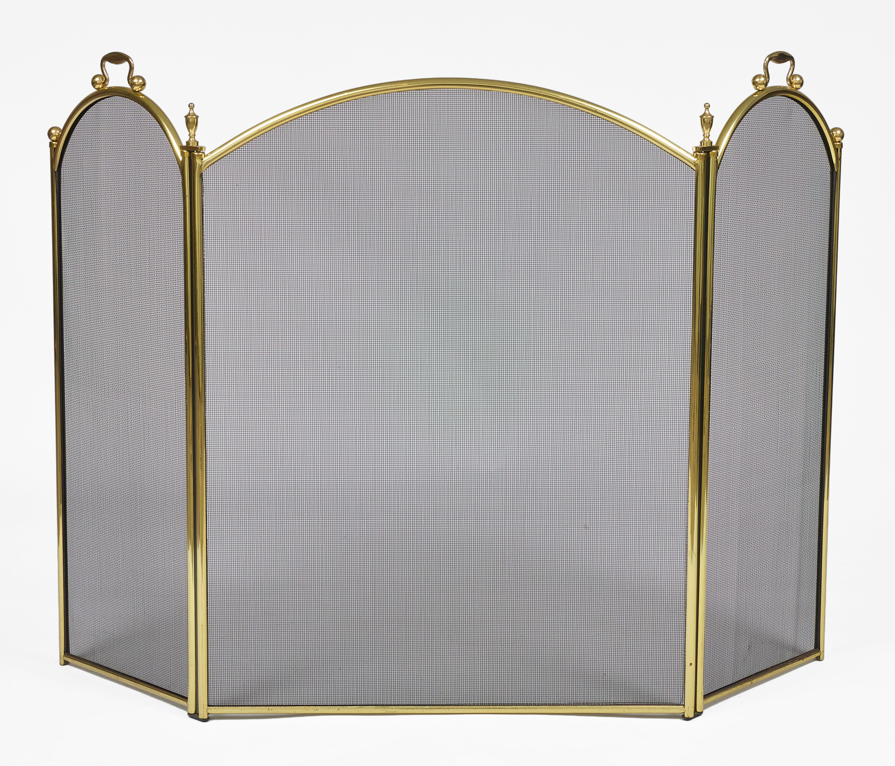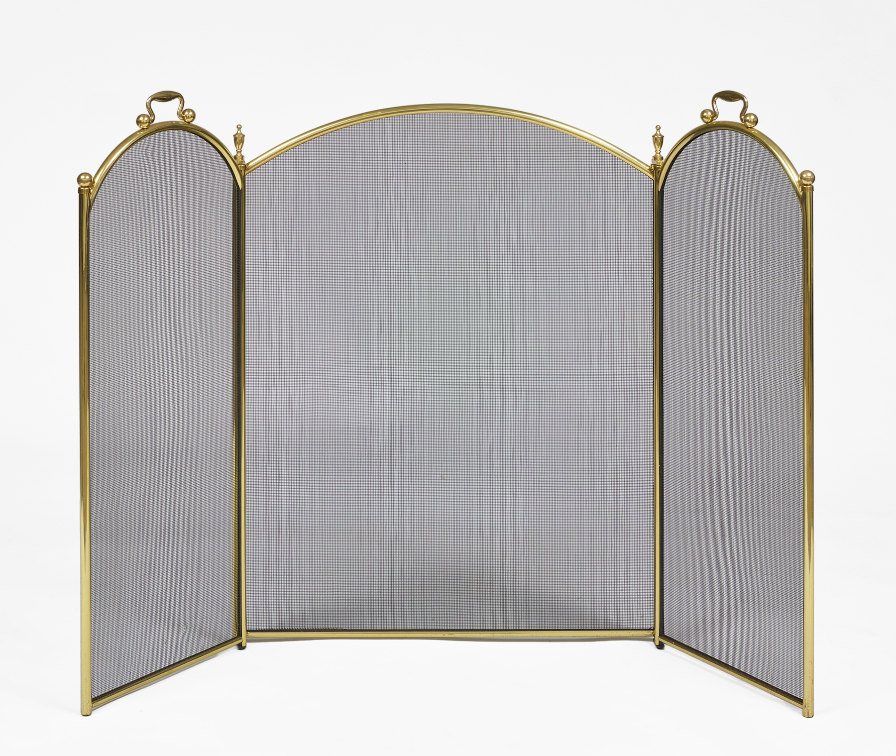 Brass and wire mesh three-part folding and adjustable fireplace screen with brass finials and handles.