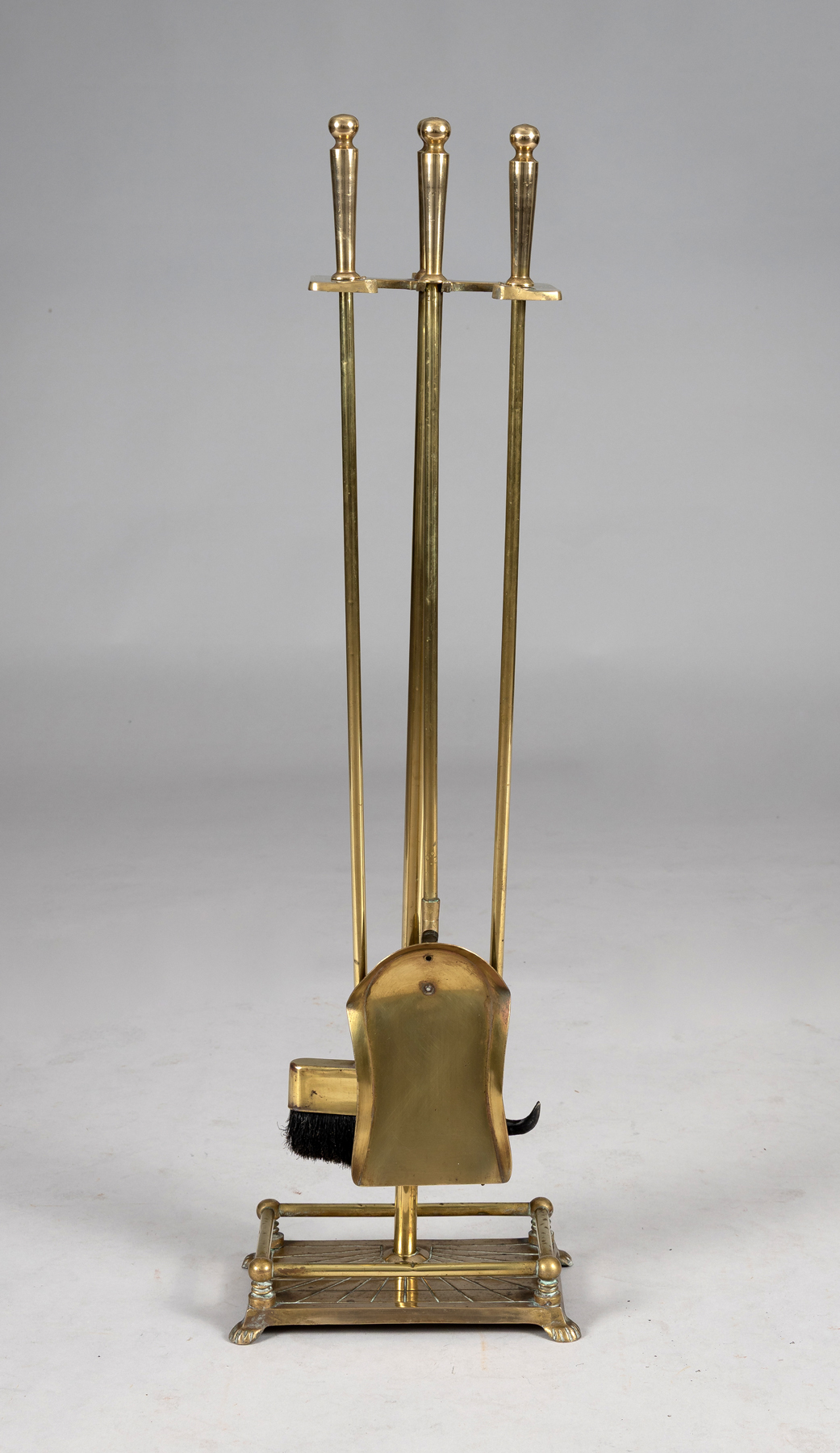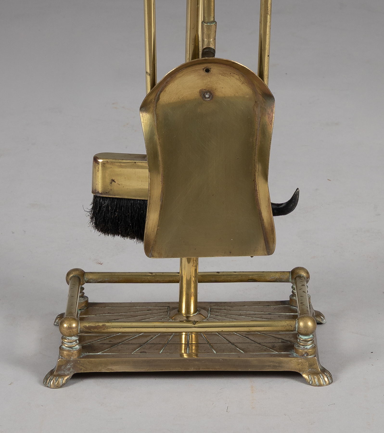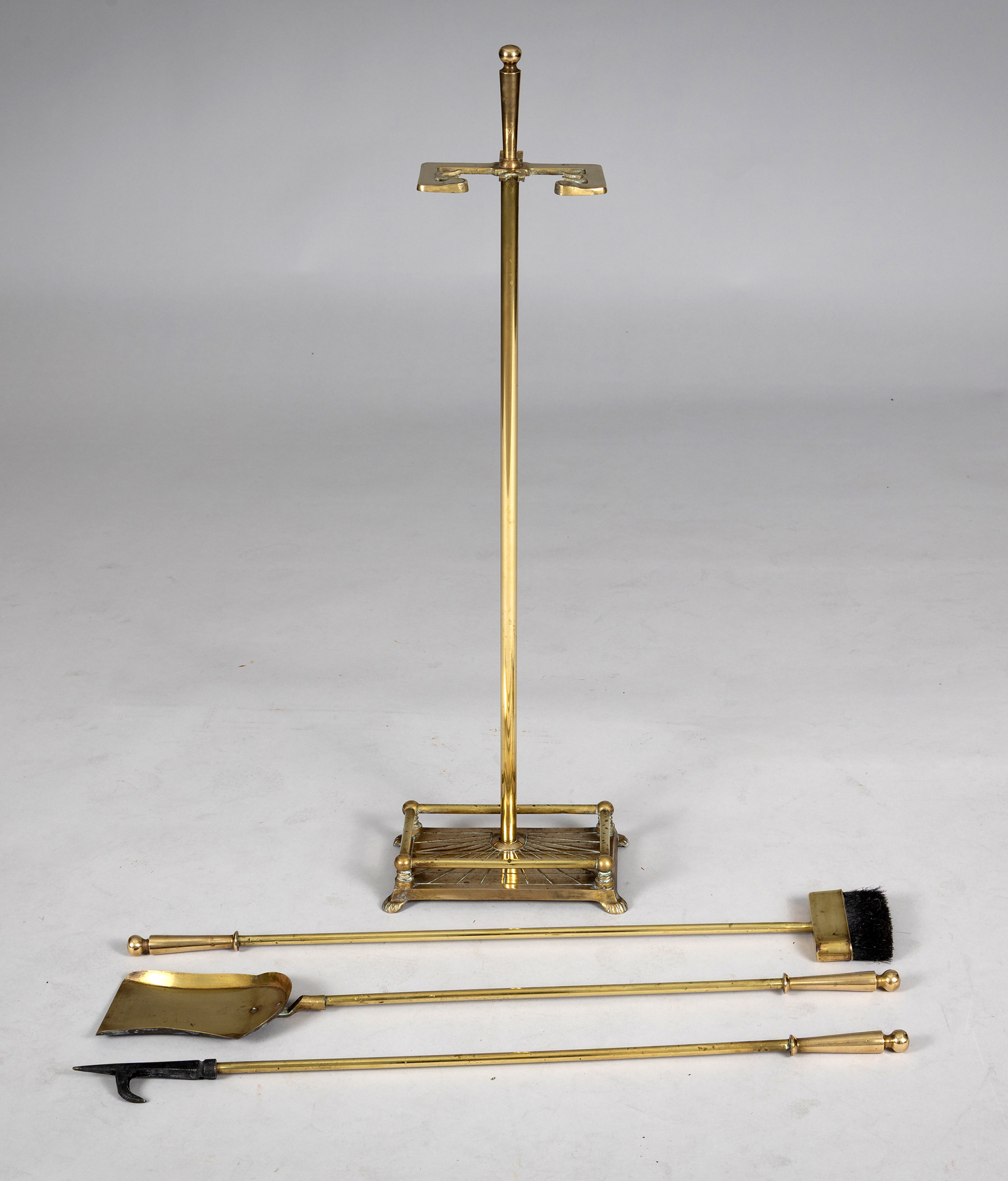 Fireplace brass tool set and stand comprised of a shovel, poker and brush, raised on a square galleried base.