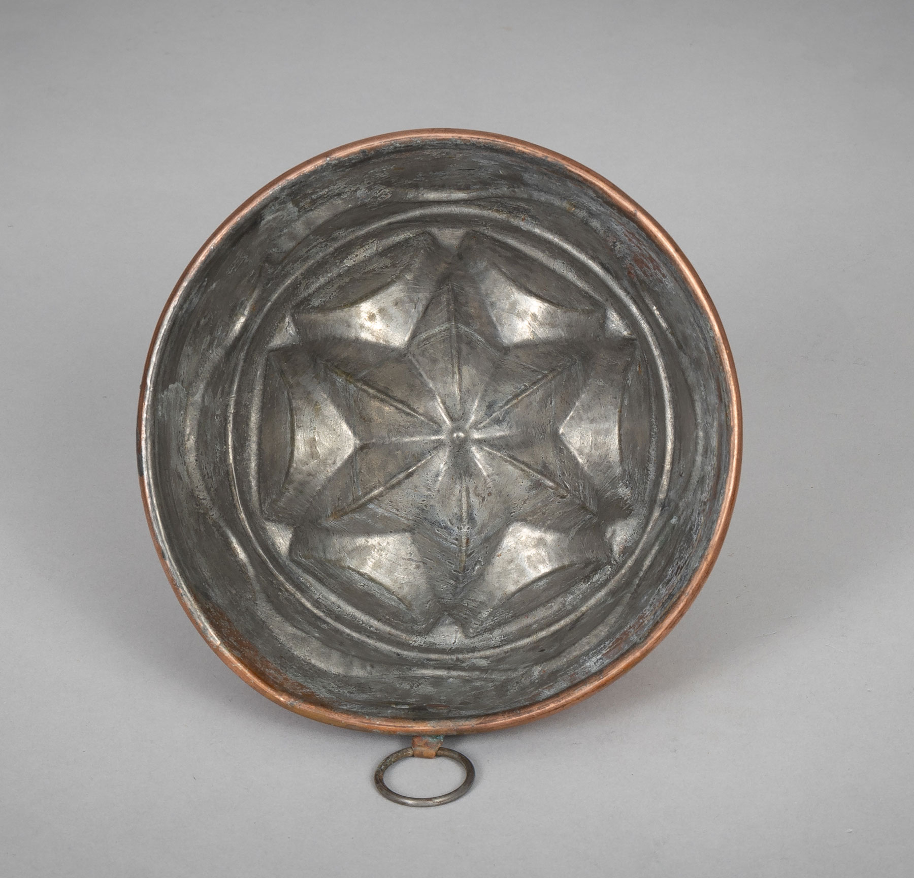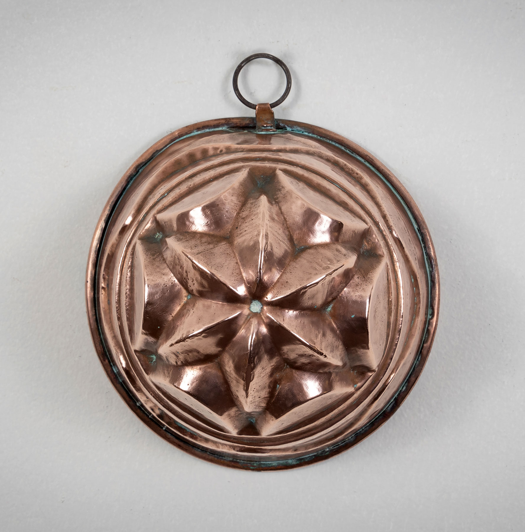 Antique English copper mold in the “Star” pattern with tin lining and metal ring for hanging.
